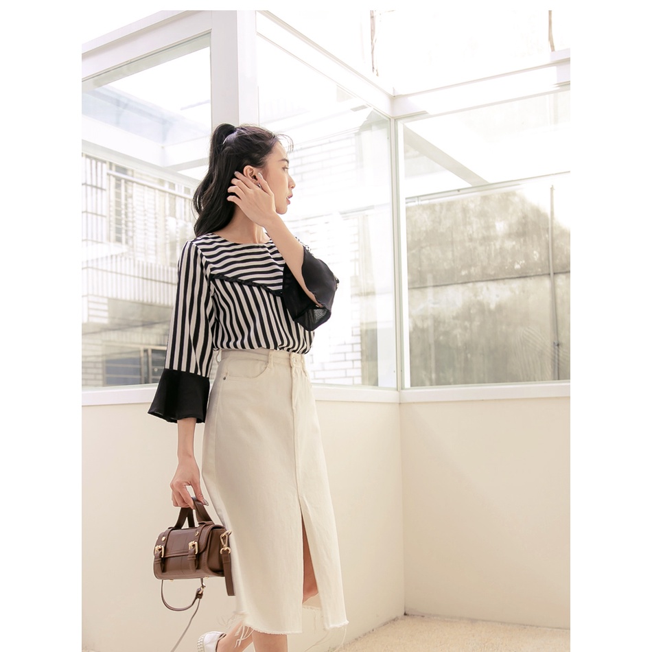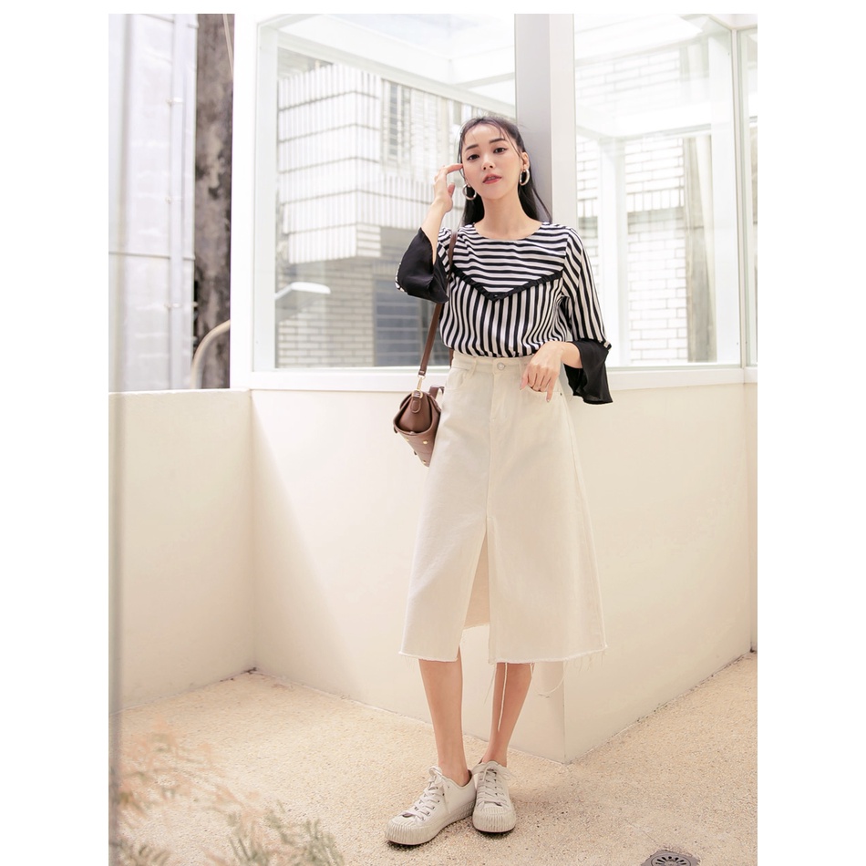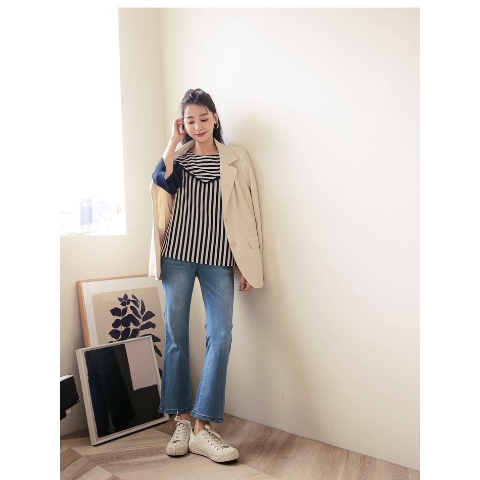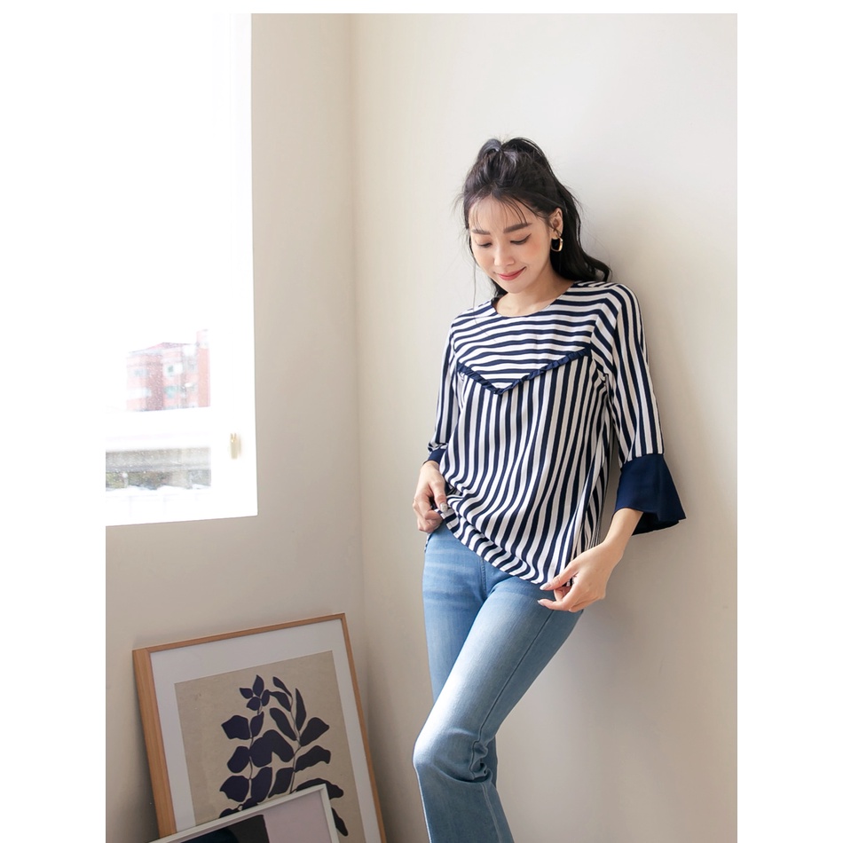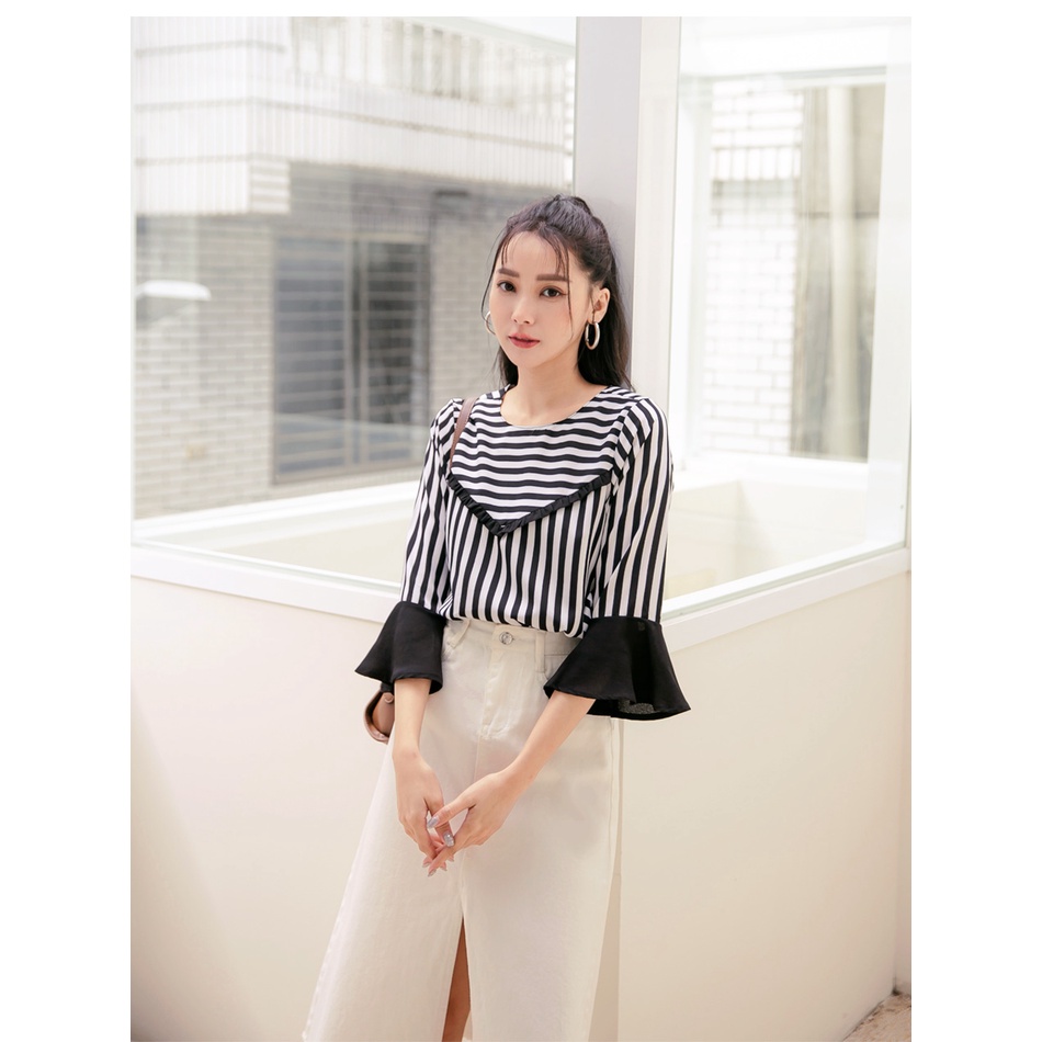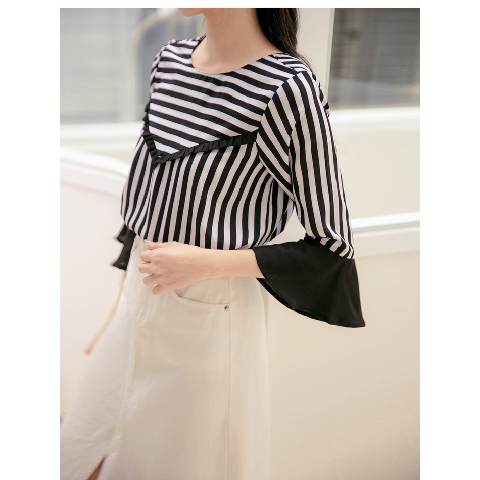 OB嚴選 圓領條紋拼接荷葉五分袖上衣 《AB16790》大尺碼/女裝/現貨