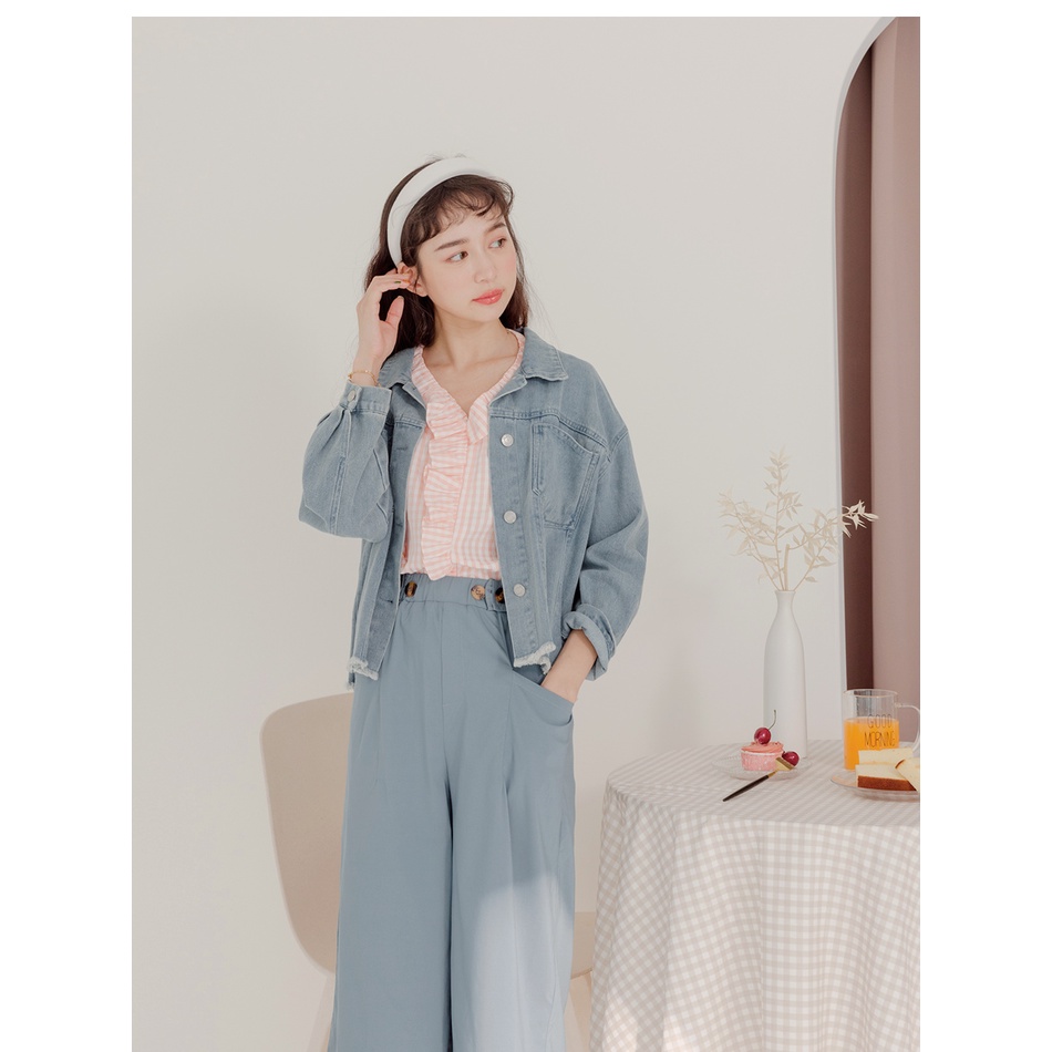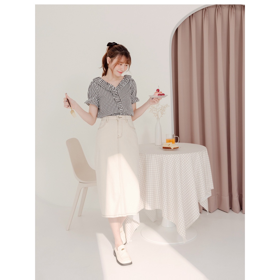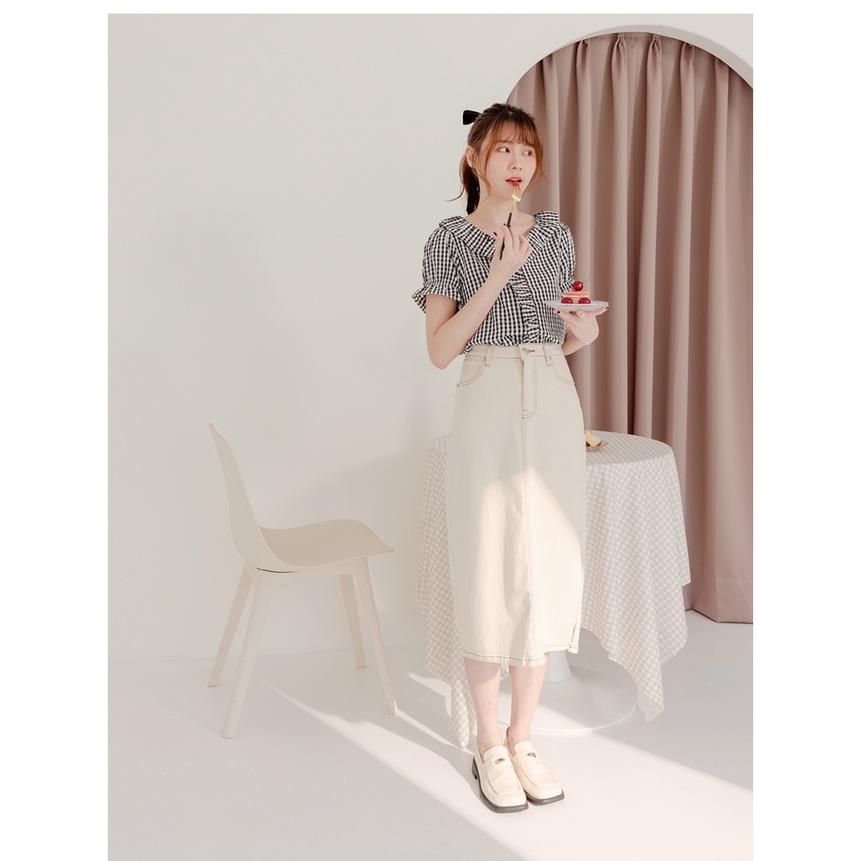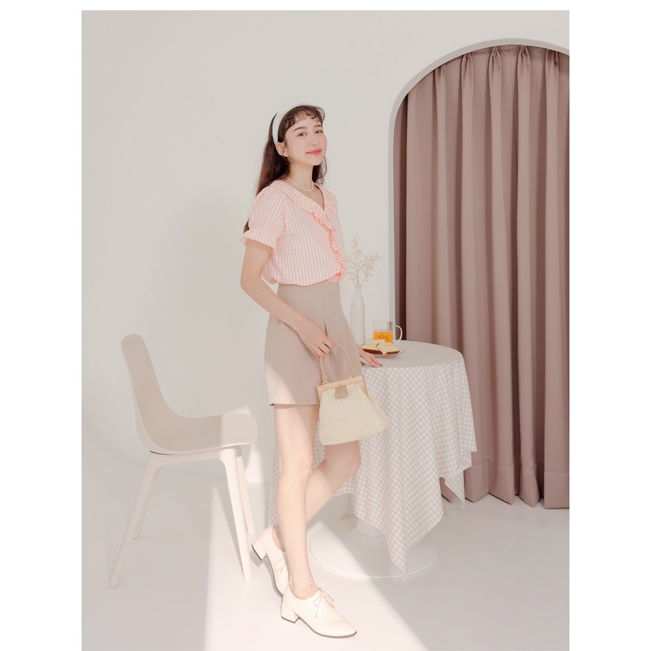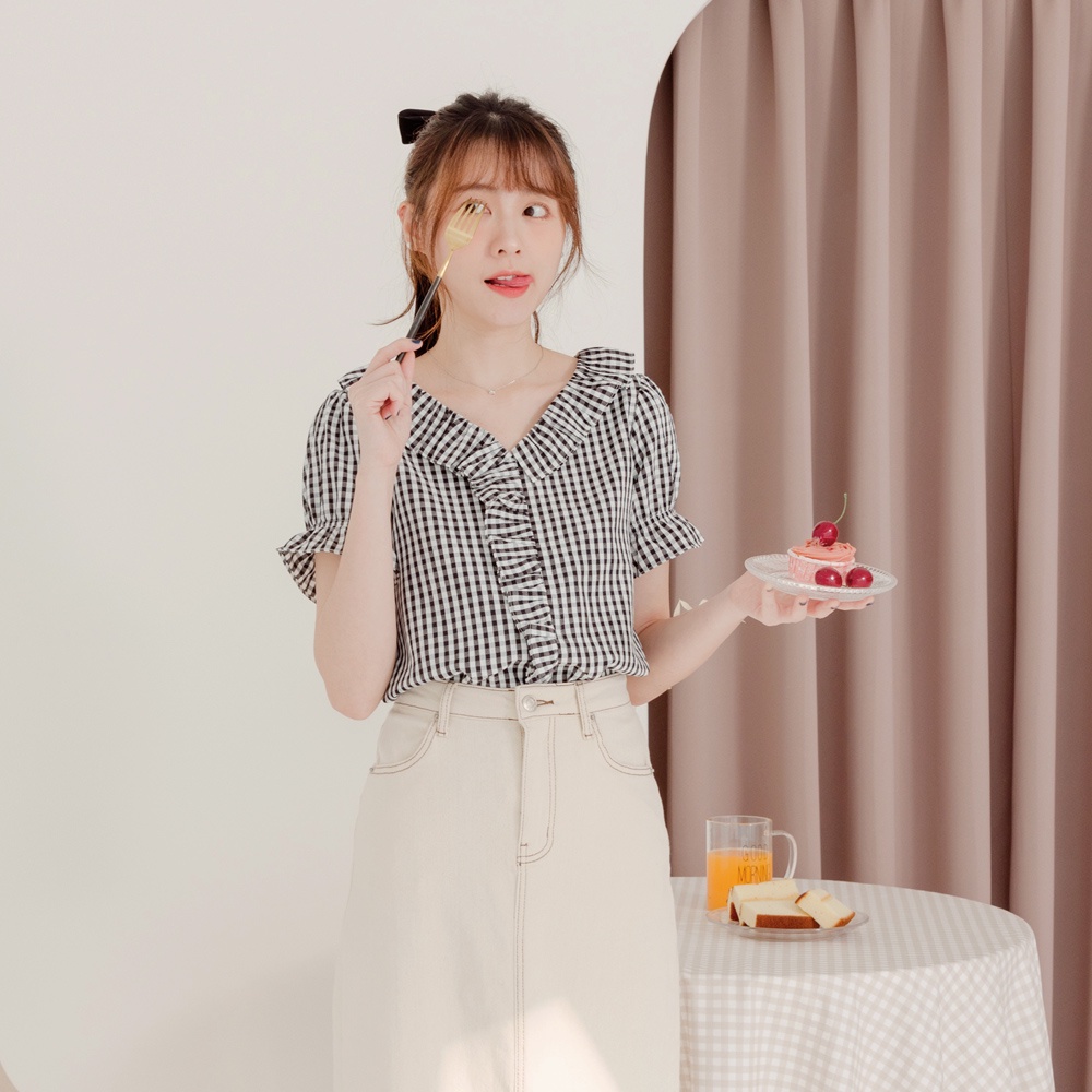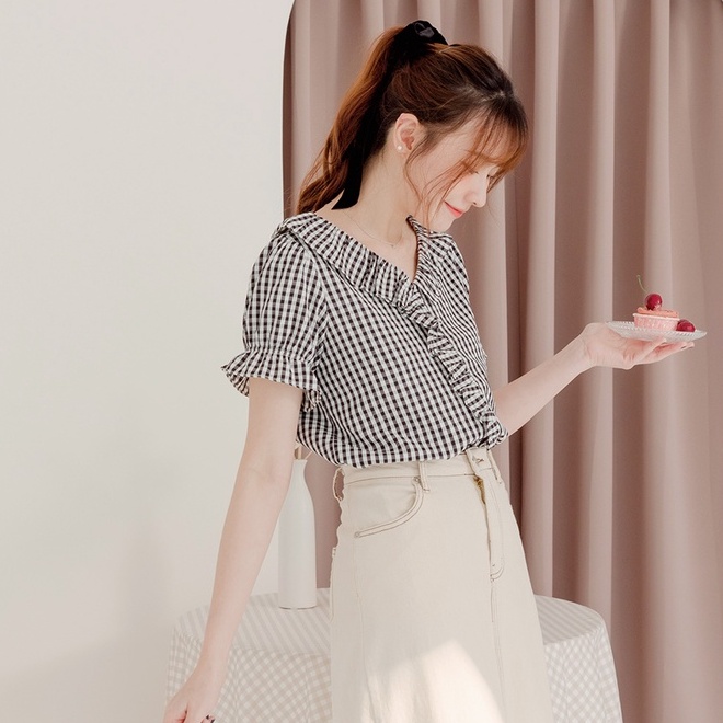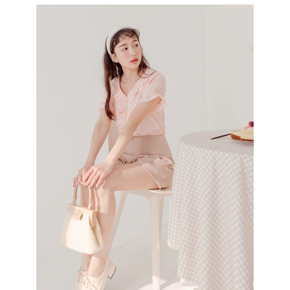 OB嚴選 不易皺格紋造型荷葉領拋袖上衣 《AB17023》大尺碼/女裝/現貨
