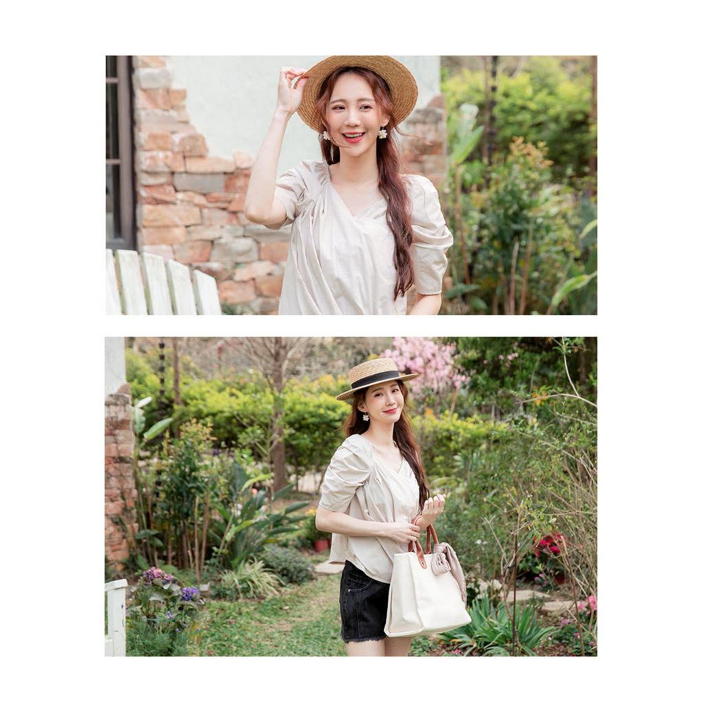 OB嚴選 韓系高含棉造型抓褶交錯V領上衣 《AB15103》