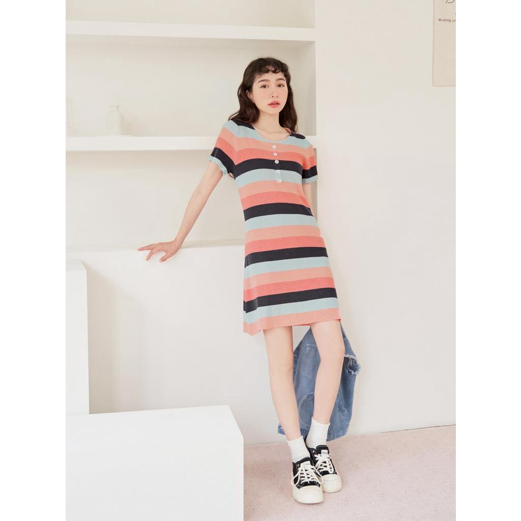 OB嚴選 撞色條紋排釦造型收腰針織洋裝 《FA2555》大尺碼/女裝/現貨