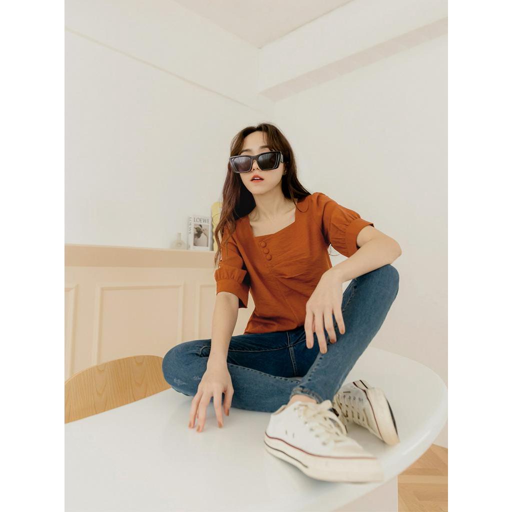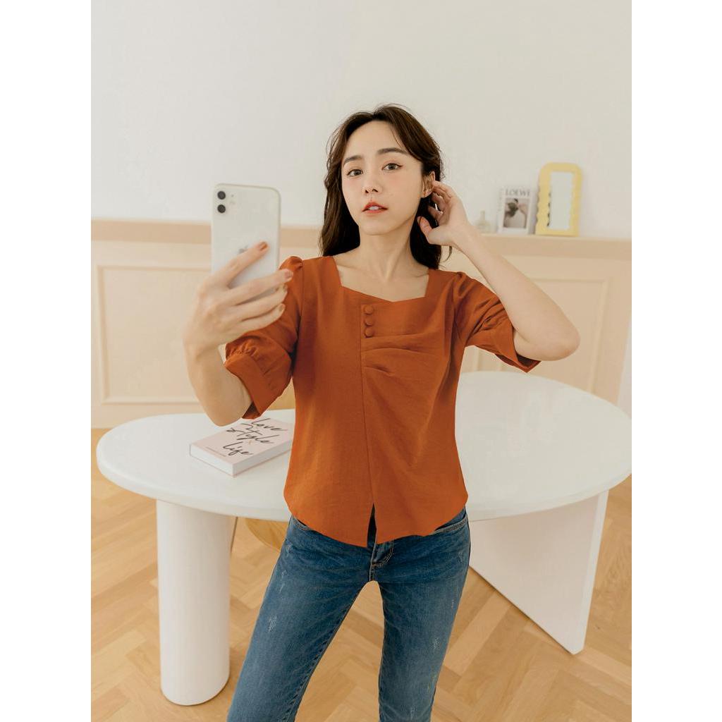 OB嚴選 小V臉.桃心領排釦抓皺七分拋袖短版上衣 《AB18176》大尺碼/女裝/現貨