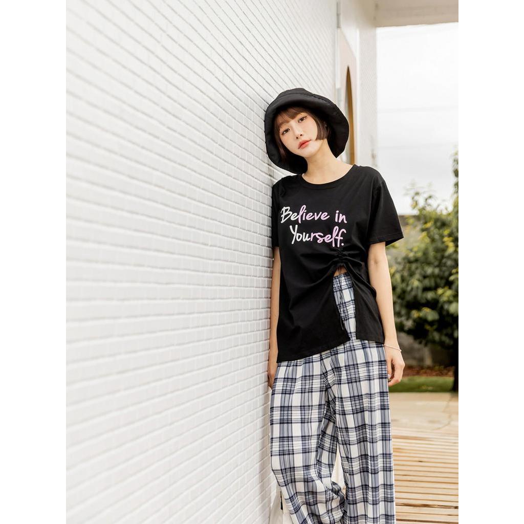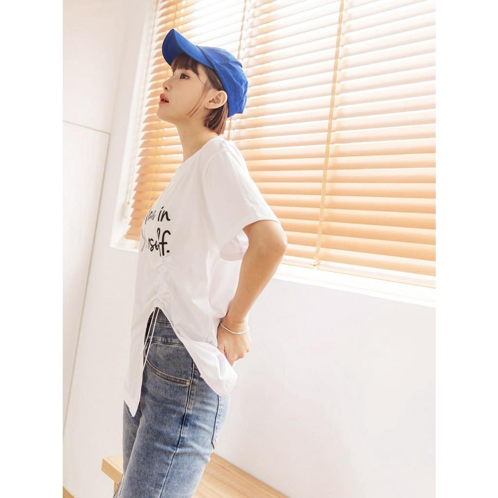 OB嚴選 棉質跳色印花抽繩開衩短袖長版上衣 《AB18582》大尺碼/現貨/女裝
