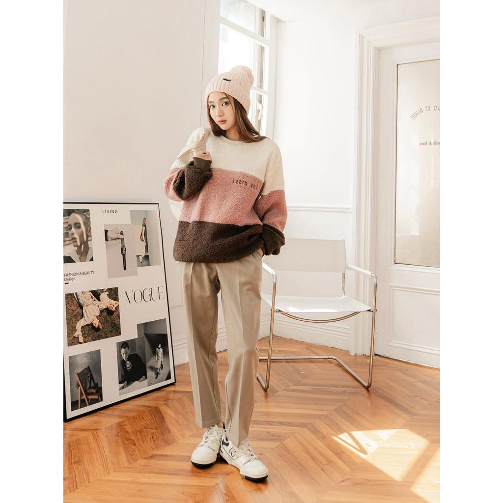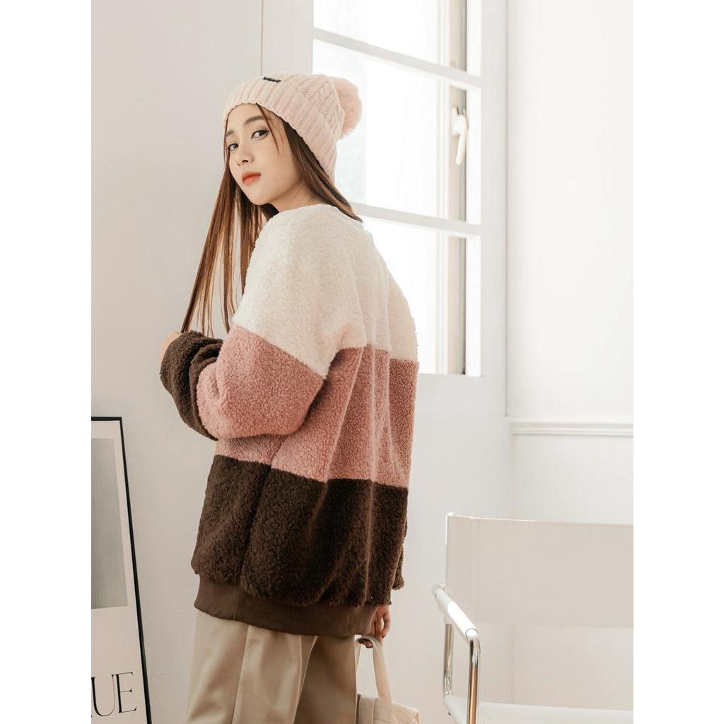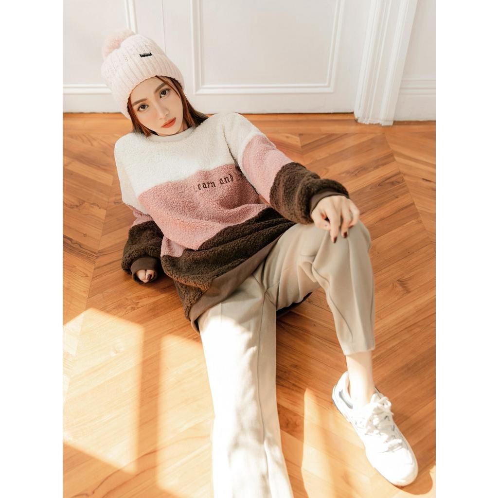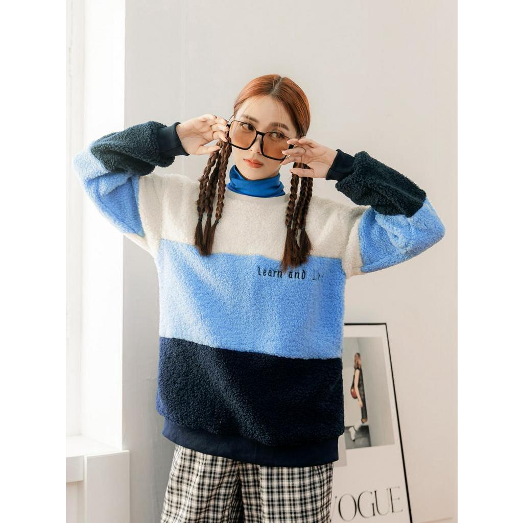 OB嚴選 亮眼撞色羊羔毛質感刺繡大學T 《AB17938》大尺碼/現貨/女裝