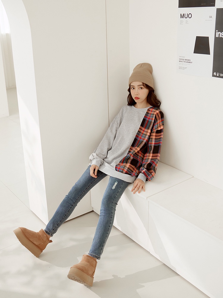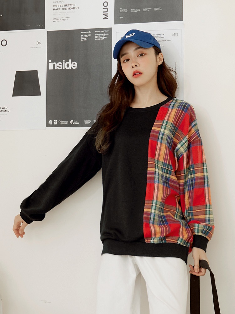 OB嚴選 棉質格紋拼接長版大學T 《AB19143》大尺碼/現貨/女裝