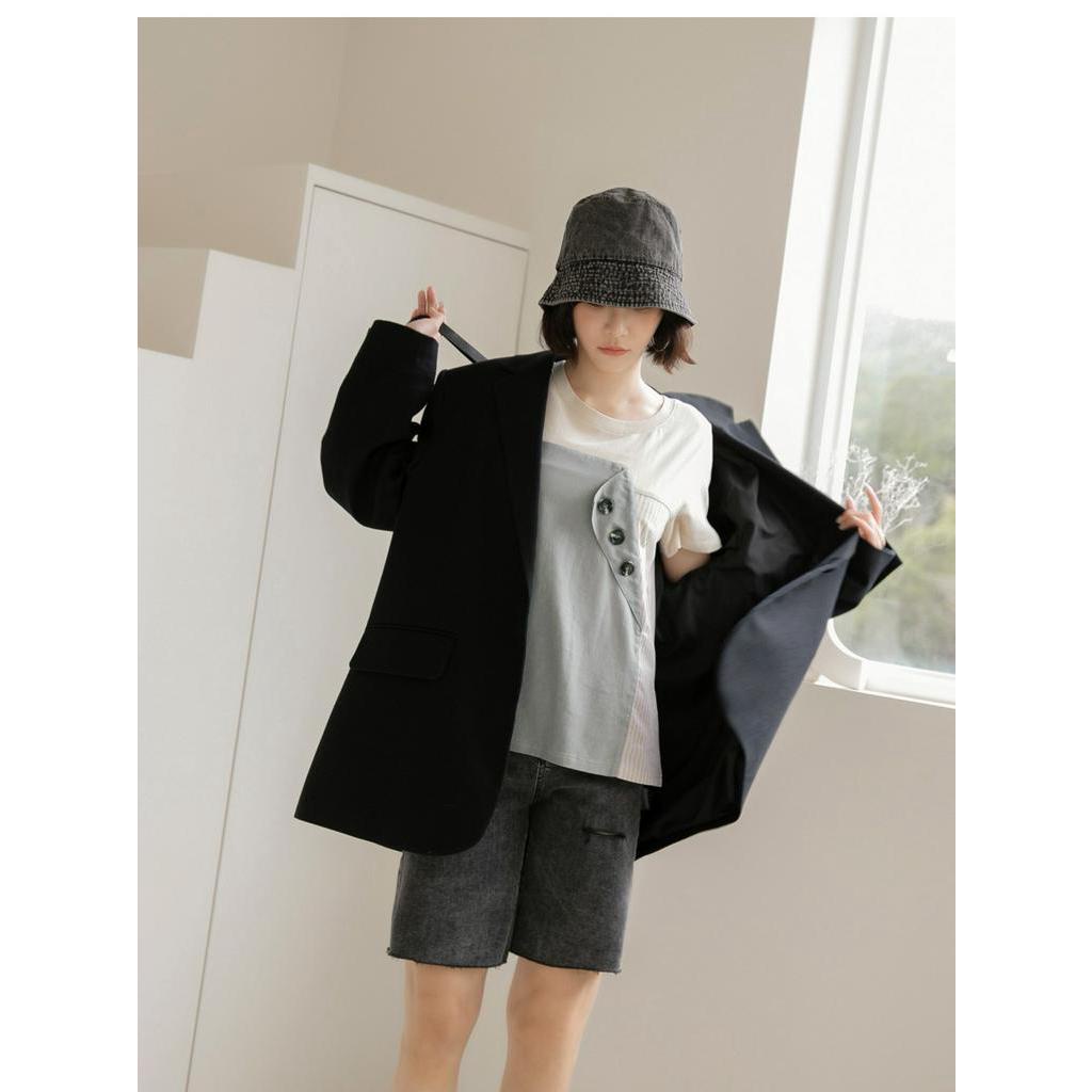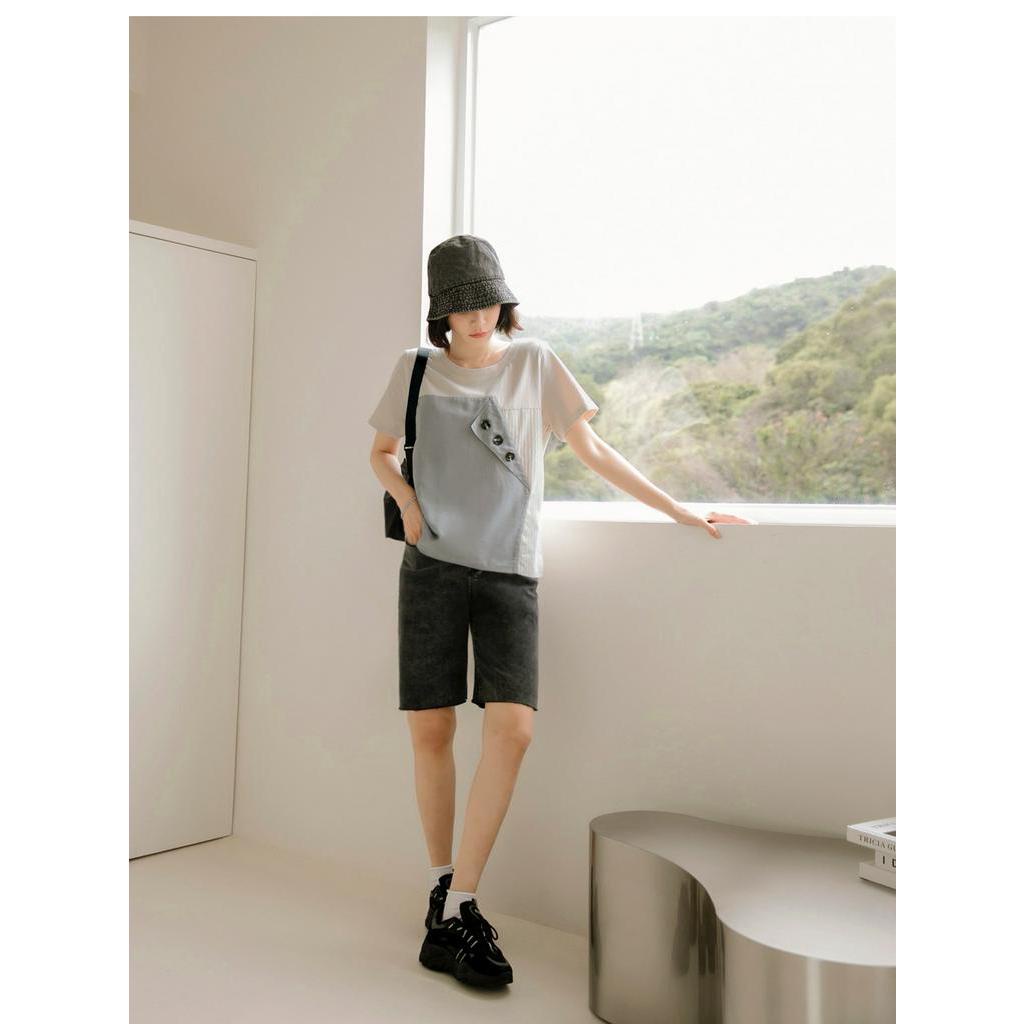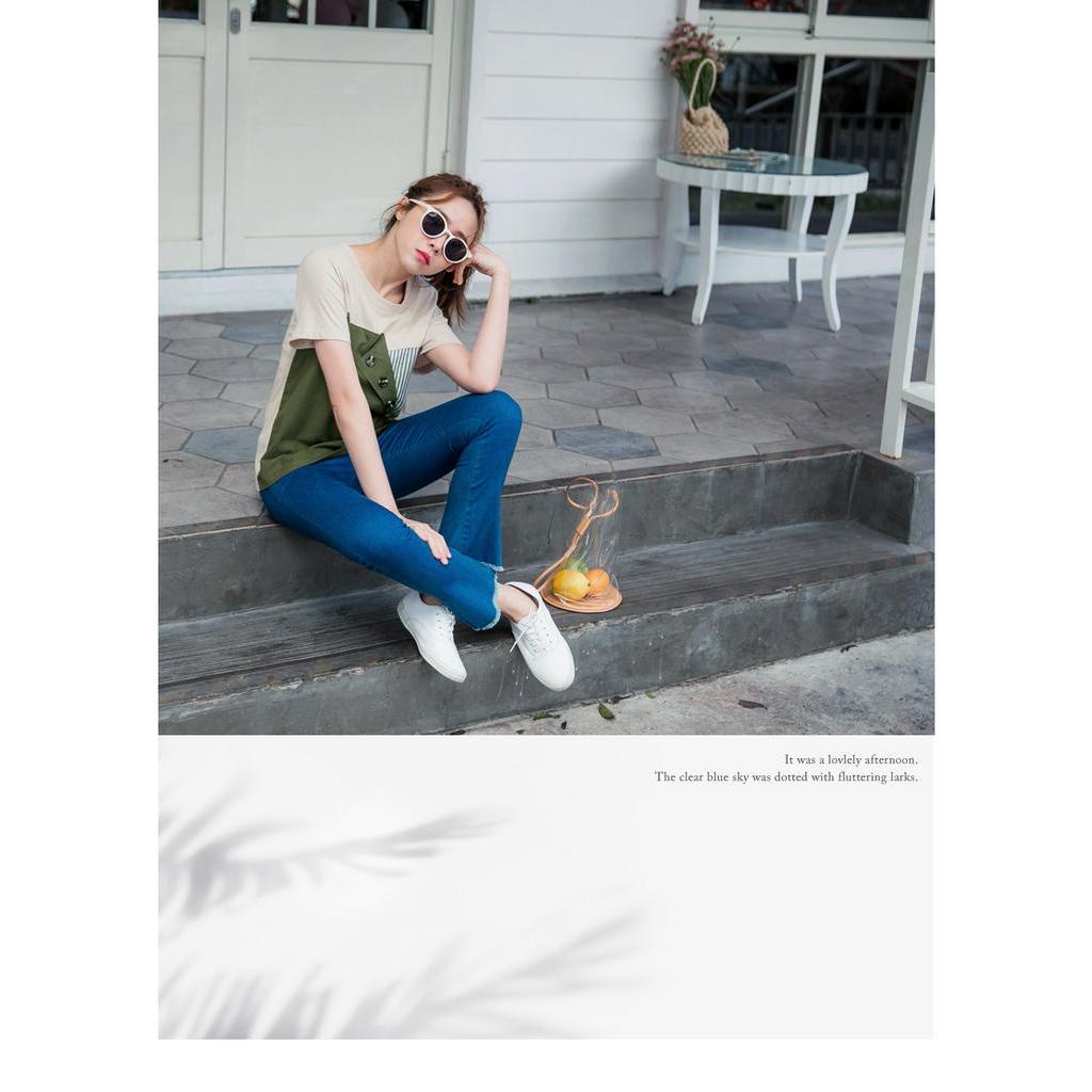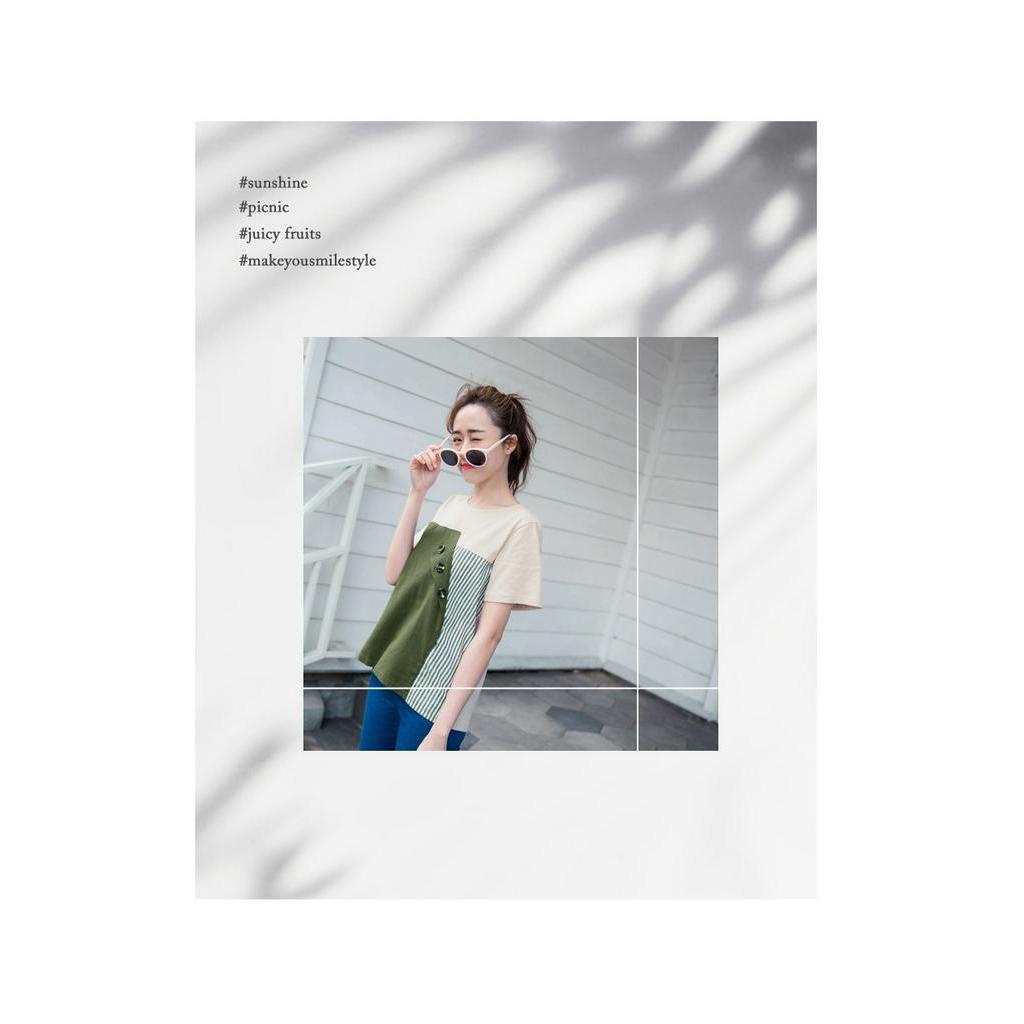 OB嚴選 高含棉排釦拼接條紋短袖上衣 《AB12217》大尺碼/現貨/女裝