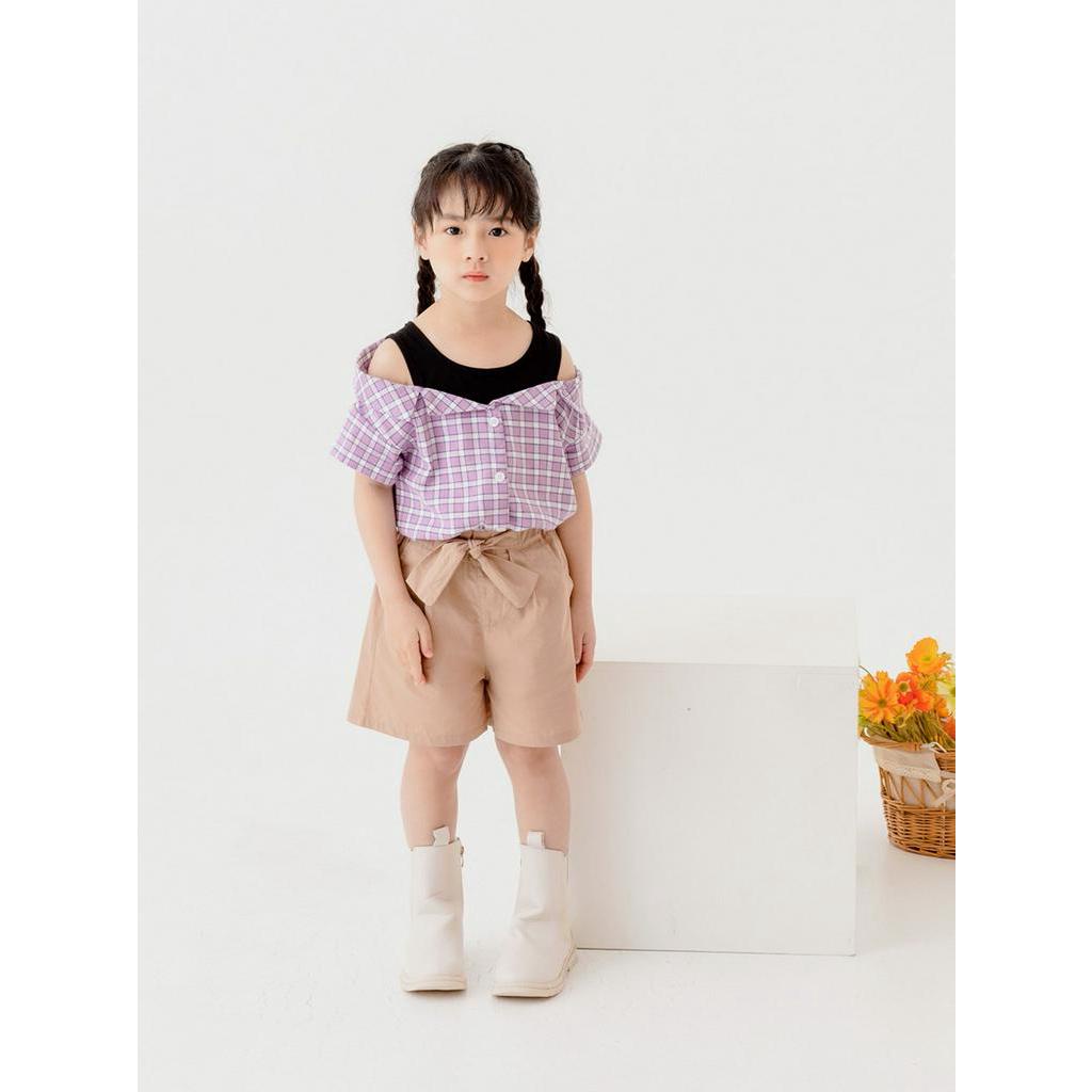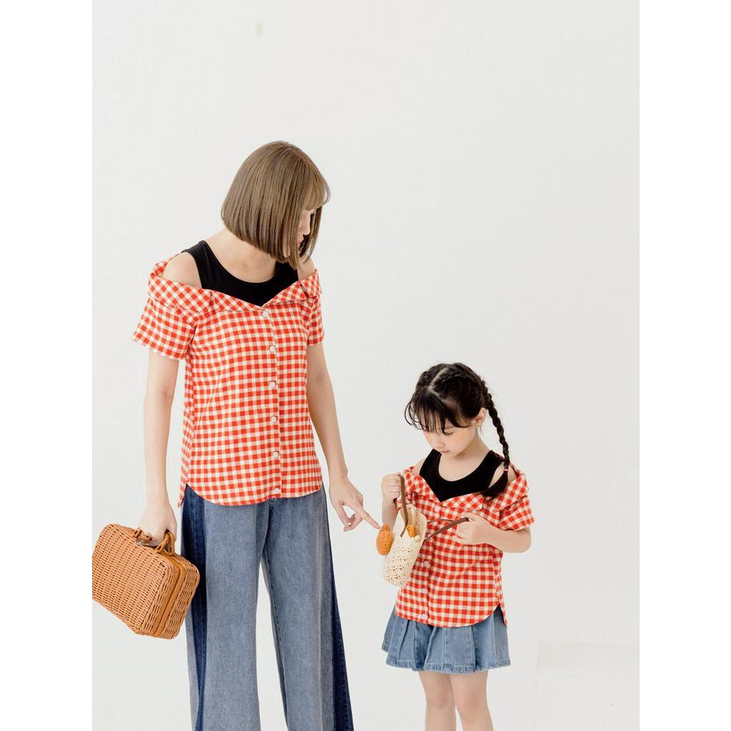 OB嚴選 假兩件純棉格紋開襟排扣翻領露肩上衣-親子款(童) 《QA1661》童裝/現貨