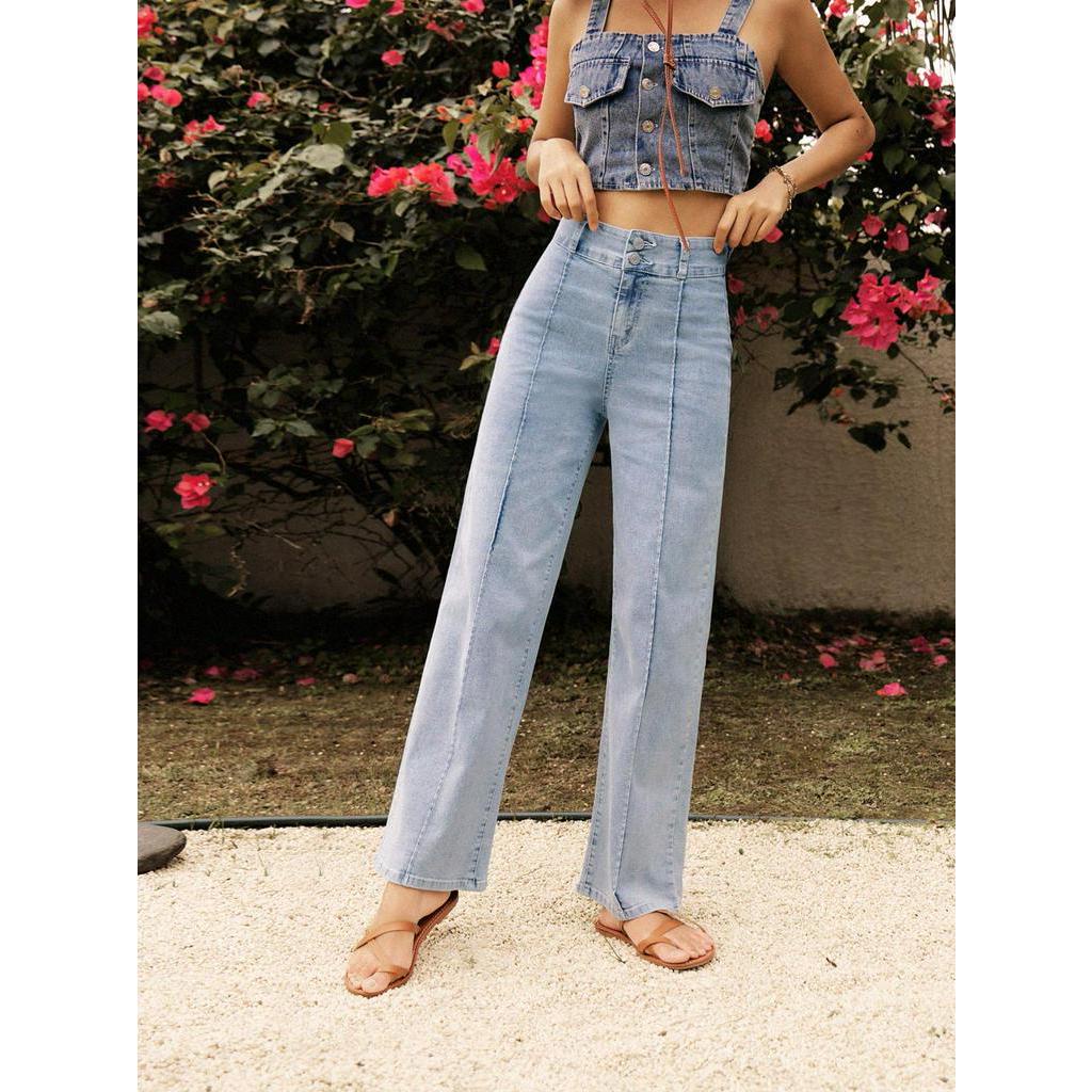 OB嚴選 棉質丹寧高腰排釦造型車線直筒寬褲 《BA7166》現貨/女裝/時髦