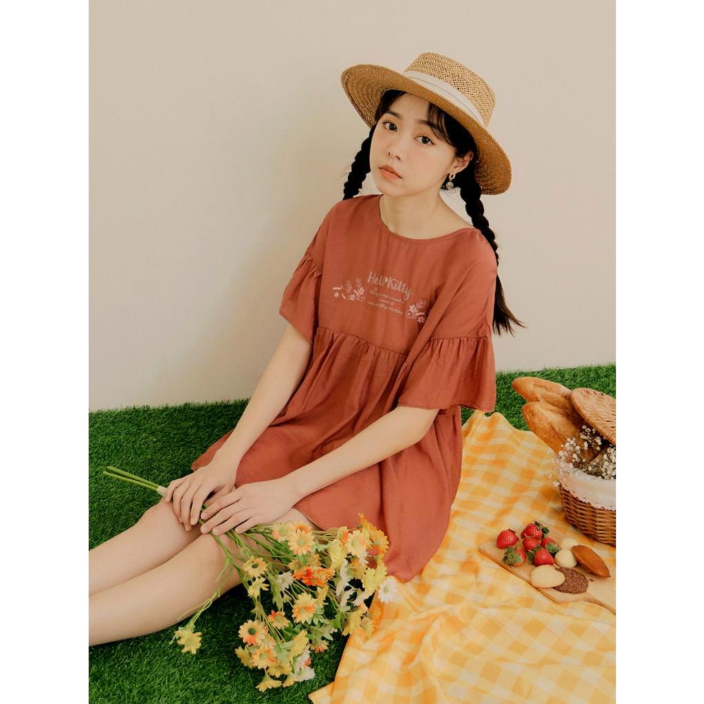 OB嚴選 KITTY 野餐系列.甜美印花荷葉袖長版上衣 《KB1479》現貨/大尺碼/女裝