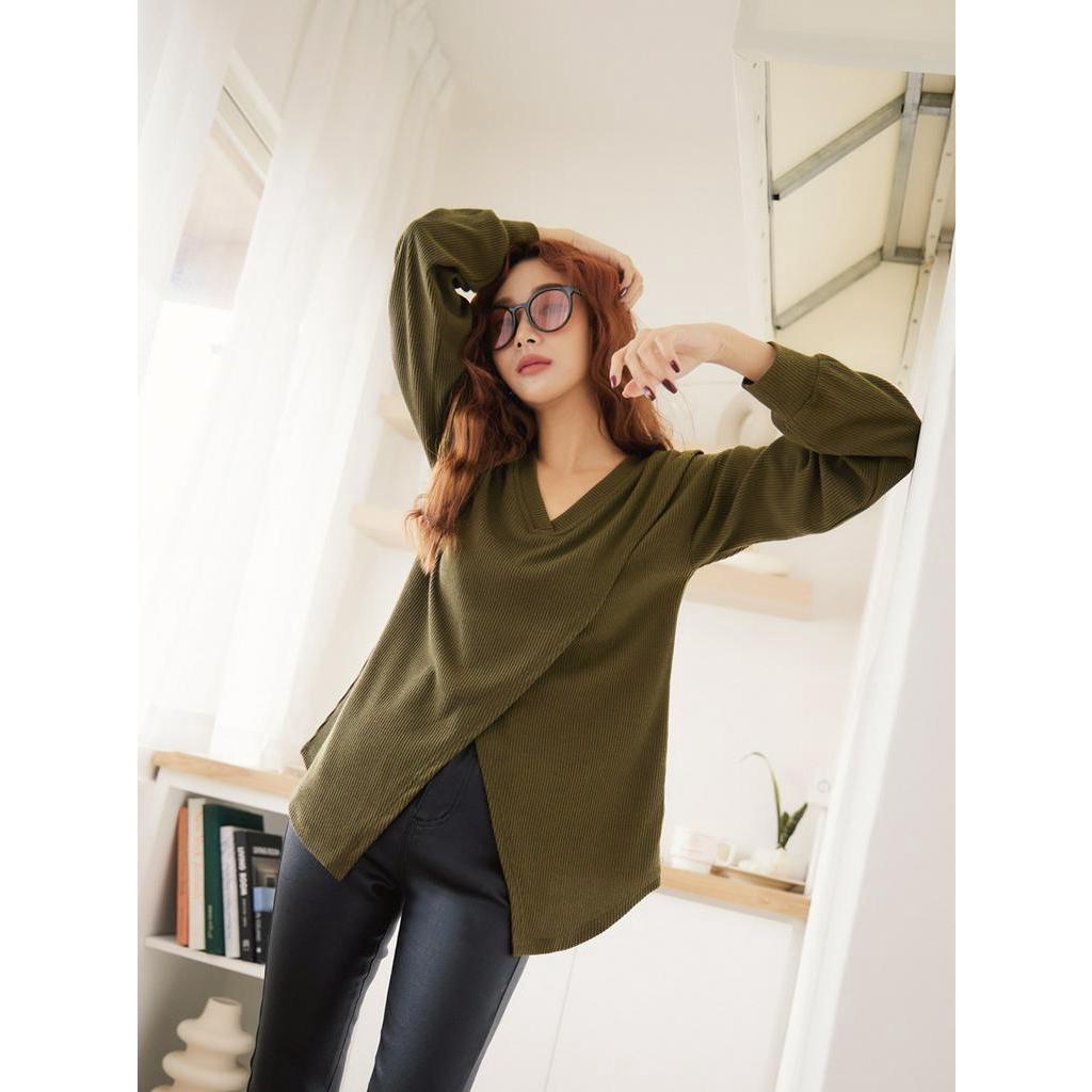 OB嚴選 小V臉.V領彈力坑條拼接開衩長袖上衣 《AB18138》大尺碼/現貨/女裝