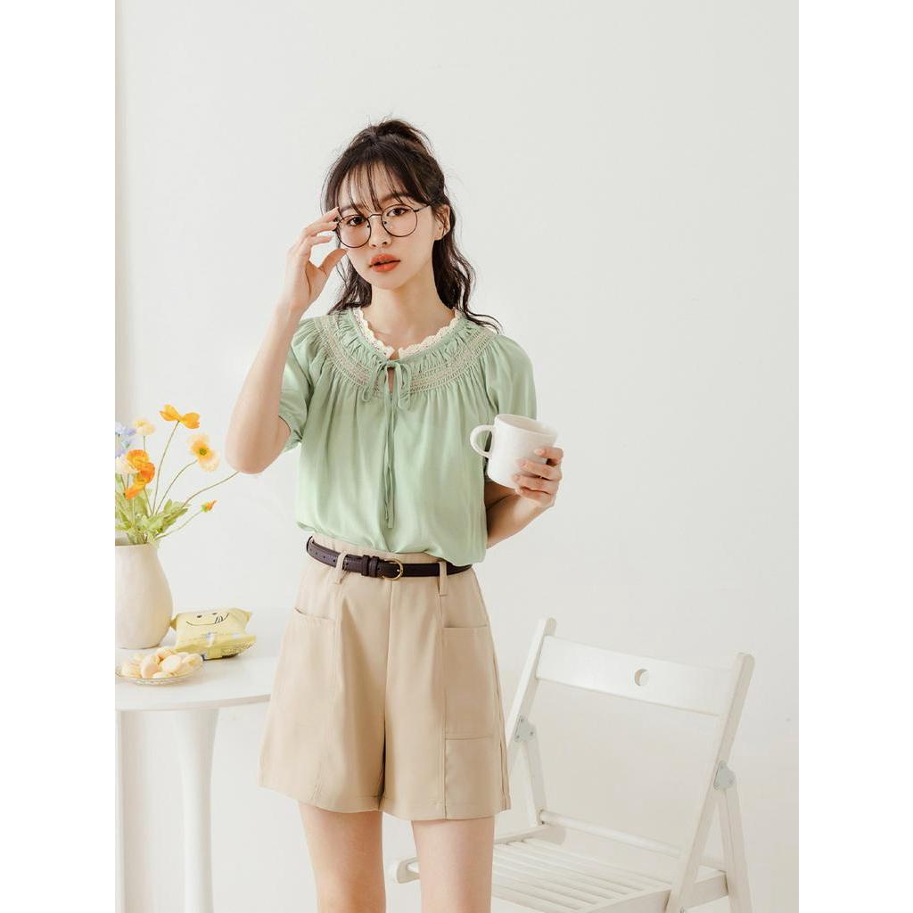 OB嚴選 蕾絲綁帶配色抓纜拋袖上衣 《AB18516》大尺碼/現貨/女裝