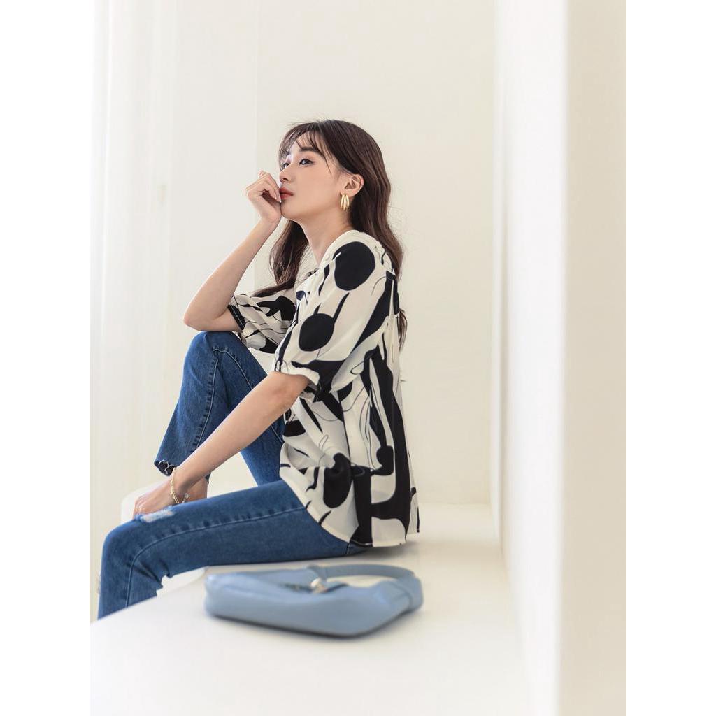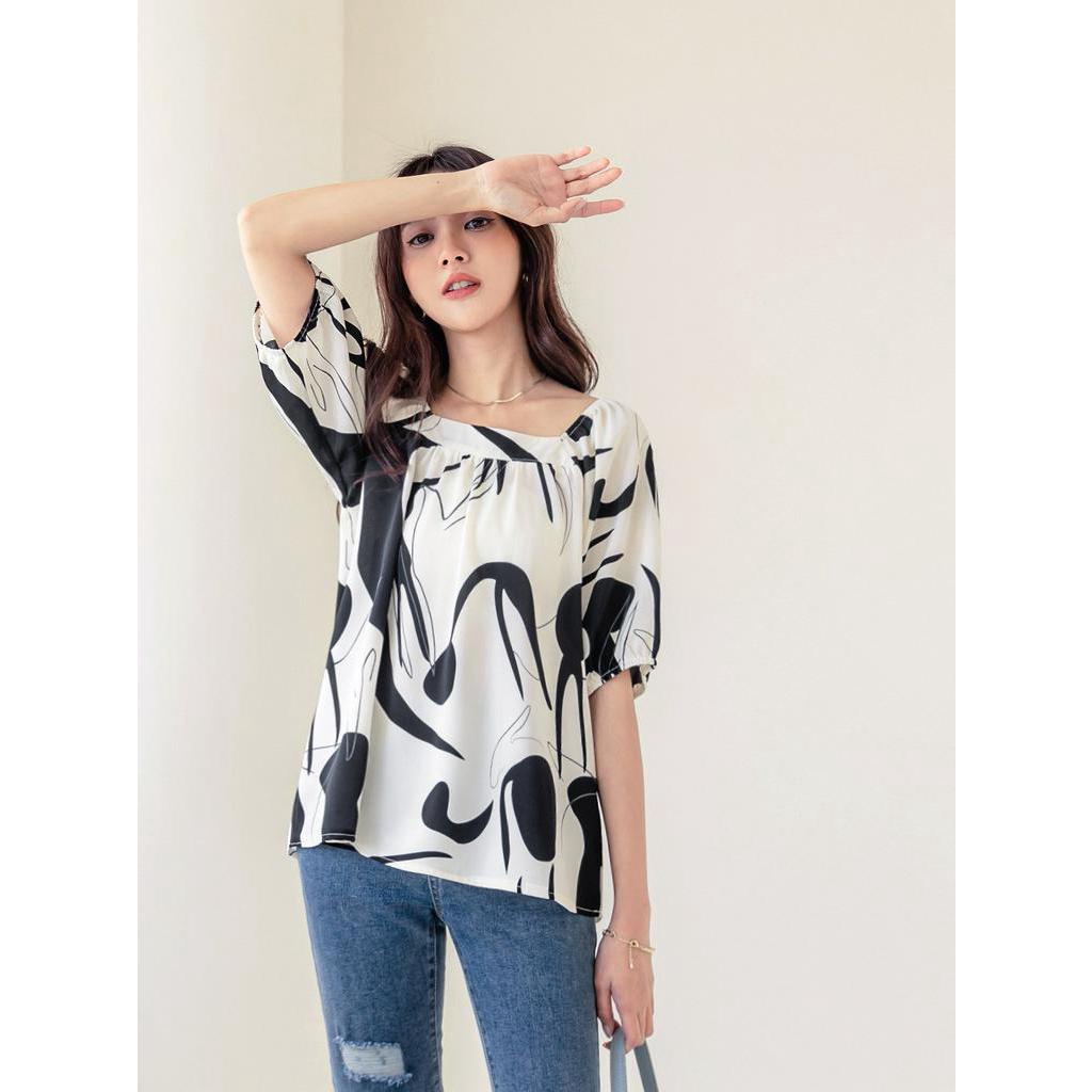OB嚴選 鬆緊方領不規則印花澎袖上衣 《AB16993》大尺碼/現貨/女裝