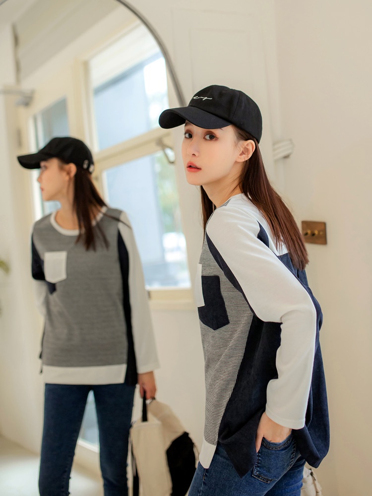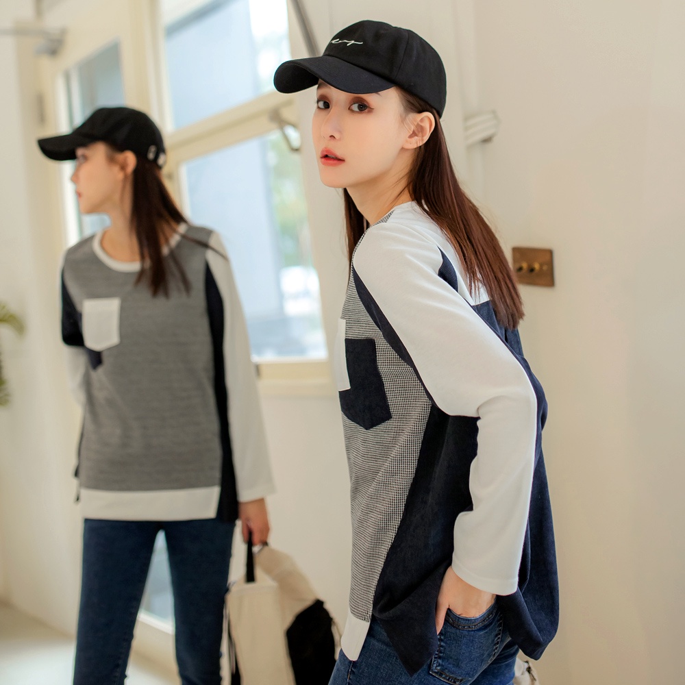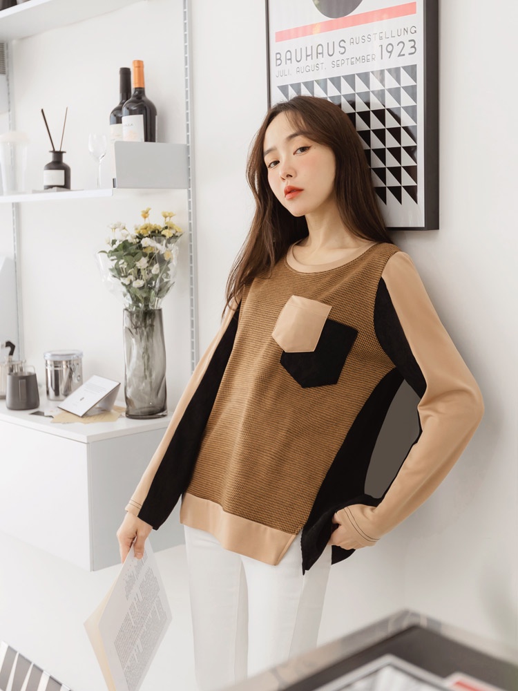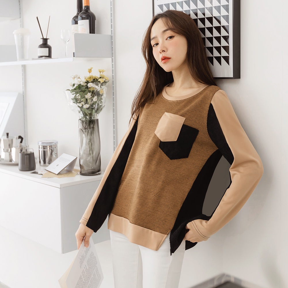 OB嚴選 千鳥格配色拼接口袋長袖長版上衣 《AB14728》大尺碼/現貨/女裝