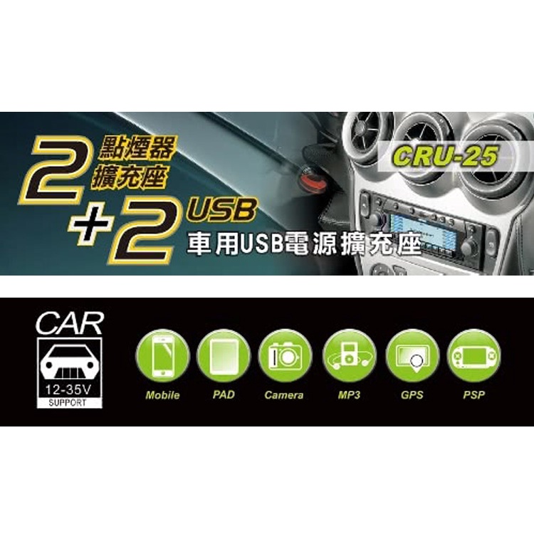 【KINYO】2點煙器孔+2USB孔3.1A擴充座(CRU-25)