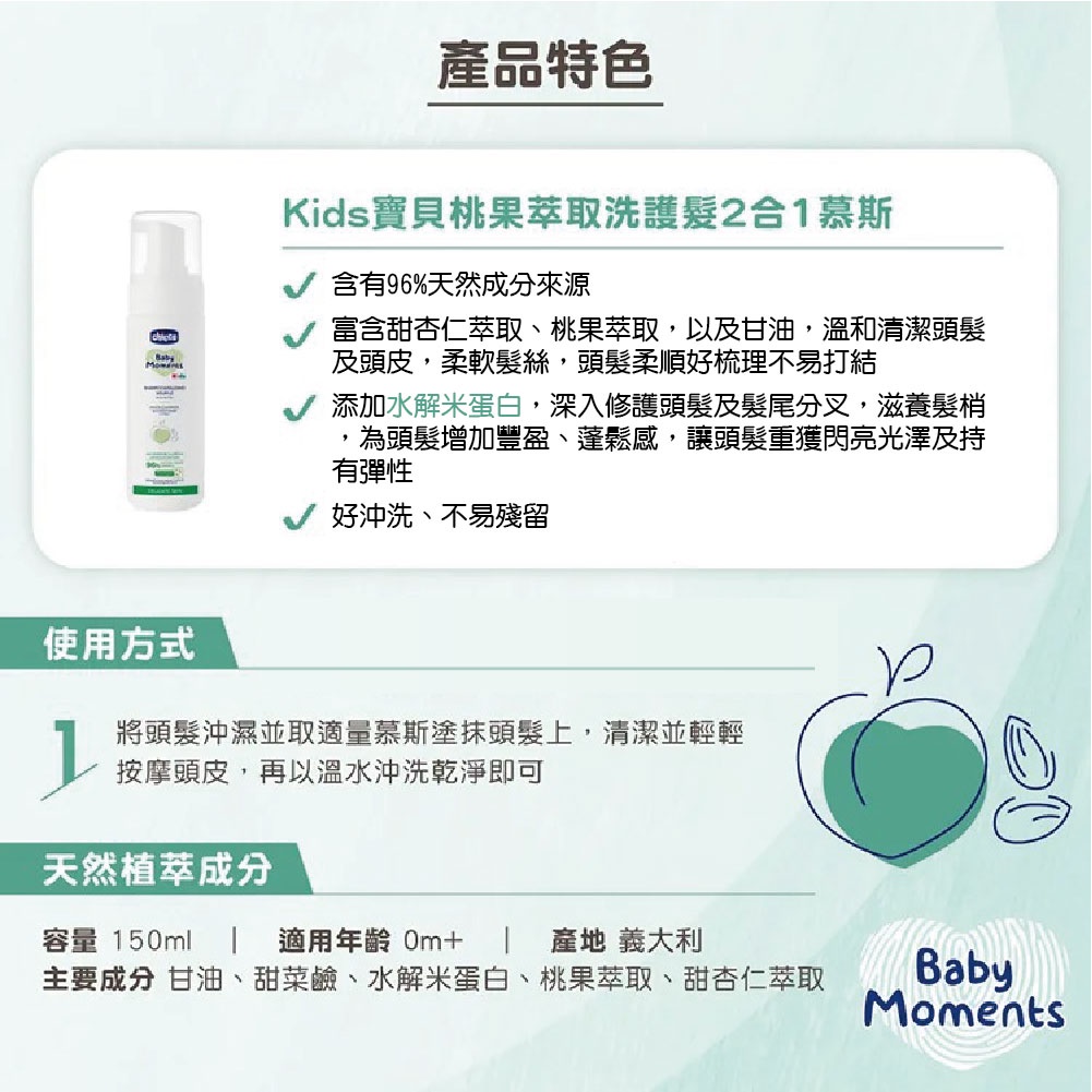 Chicco Kids寶貝桃果萃取洗護髮2合1慕斯 150ml【宜兒樂】