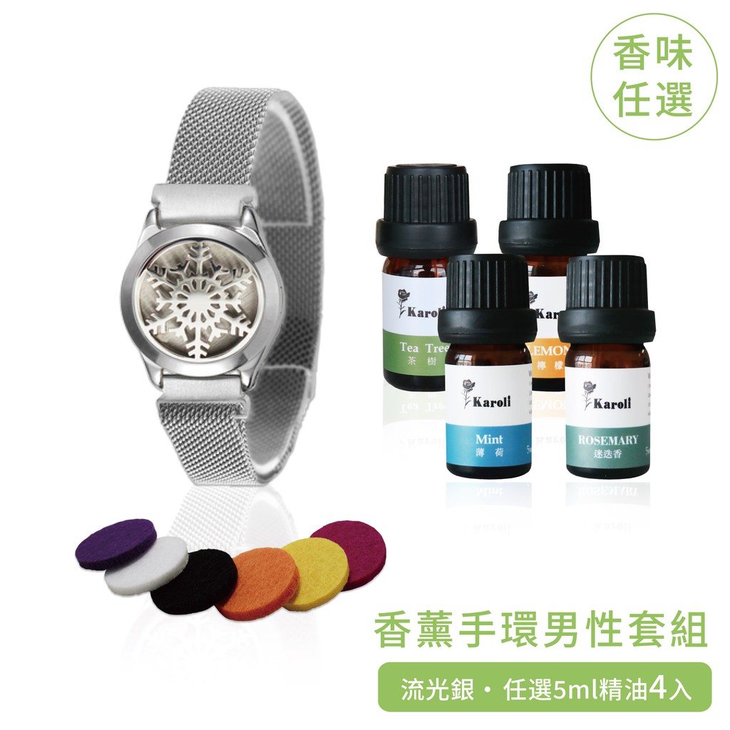 【Karoli】香氛手環-流光銀&有機精油5ml*4 男性熱銷組 情人節禮物/情侶手鍊/男生禮物/交換禮物 生日禮物