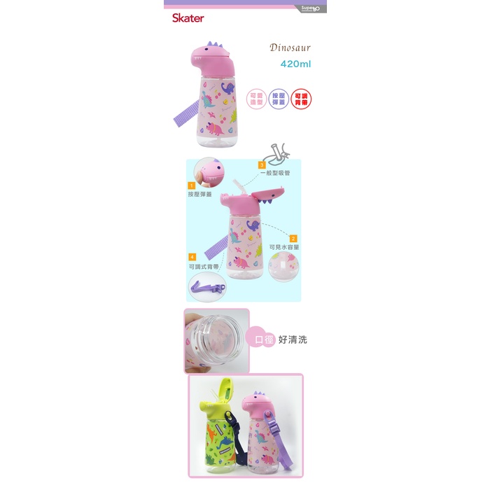 Skater 恐龍吸管水壺420ml(粉/綠)