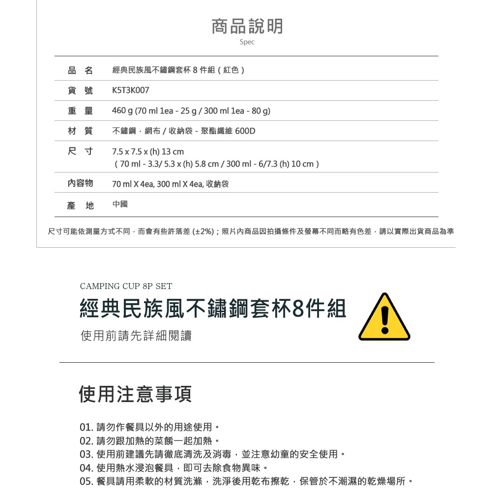 早點名| KAZMI KZM 經典民族風不鏽鋼套杯8件組(紅色) 露營杯 杯組 慶祝杯 同樂杯 水杯