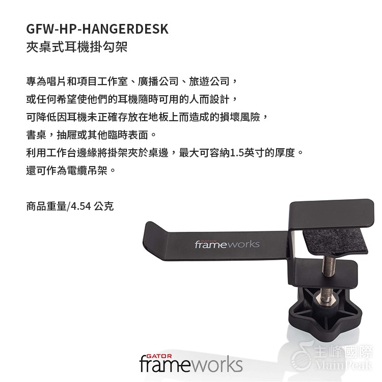 Gator Frameworks GFW-HP-HANGERDESK 夾式耳機掛勾架 耳機掛勾 耳罩收納 桌邊架 耳罩