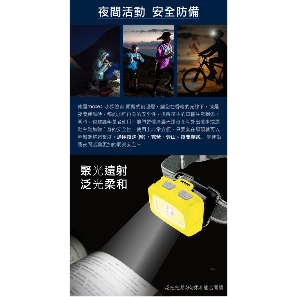 【德國Moses】小探險家-頭戴式夜間前照燈 / 露營 / 維修照明 / 登山 / 夜間觀察