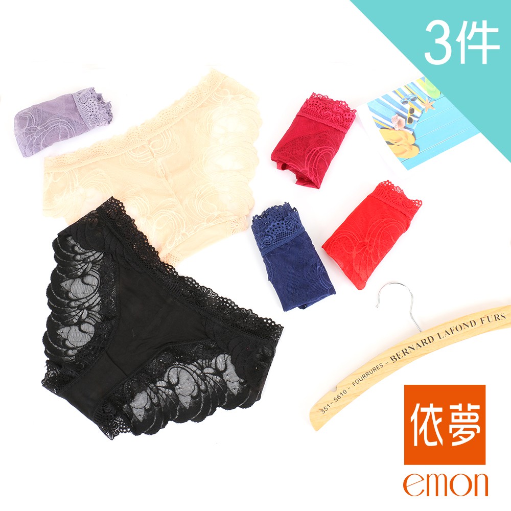 emon 性感透膚後片蕾絲三角褲 3件組(隨機色)