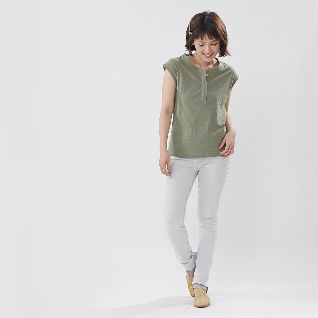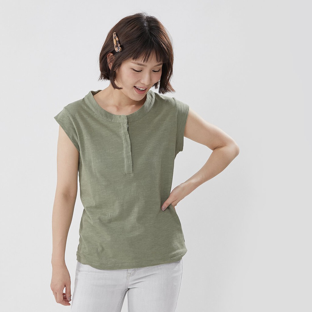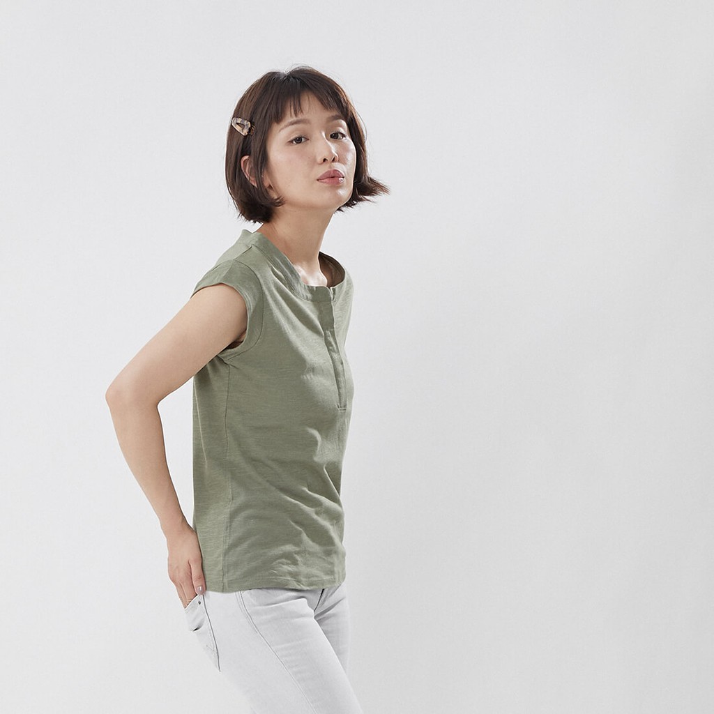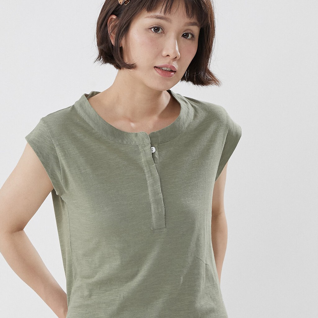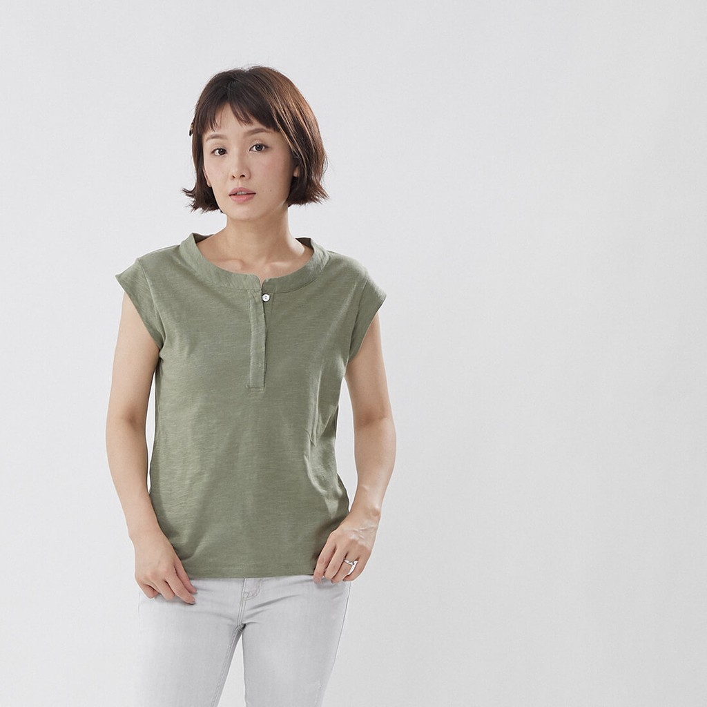 竹節棉半襟小蓋袖上衣/軍綠