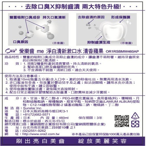 Ora2 me淨白清新漱口水460ml-清香蘋果