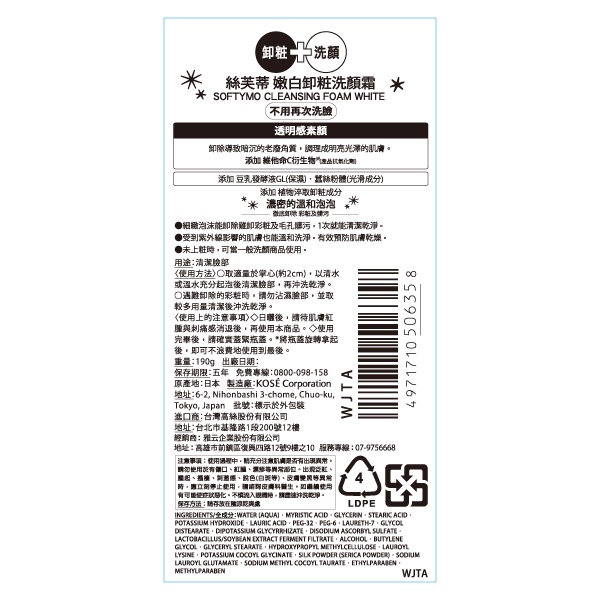 softymo 絲芙蒂嫩白卸粧洗顏霜190g
