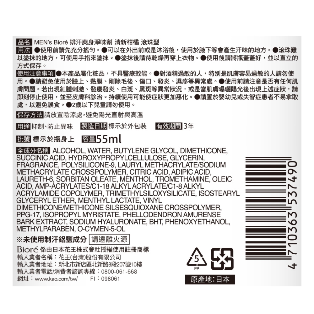 MEN’S Biore蜜妮 排汗爽身淨味劑Z柑橘滾珠55ml(包裝隨機)