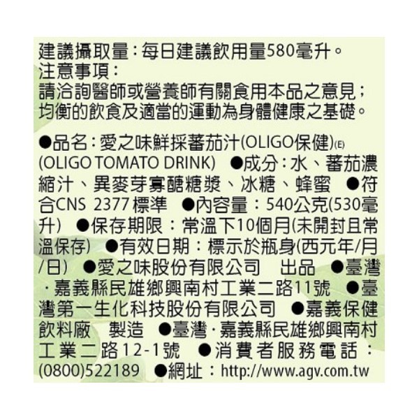 愛之味鮮採蕃茄汁oligoPET540x24瓶