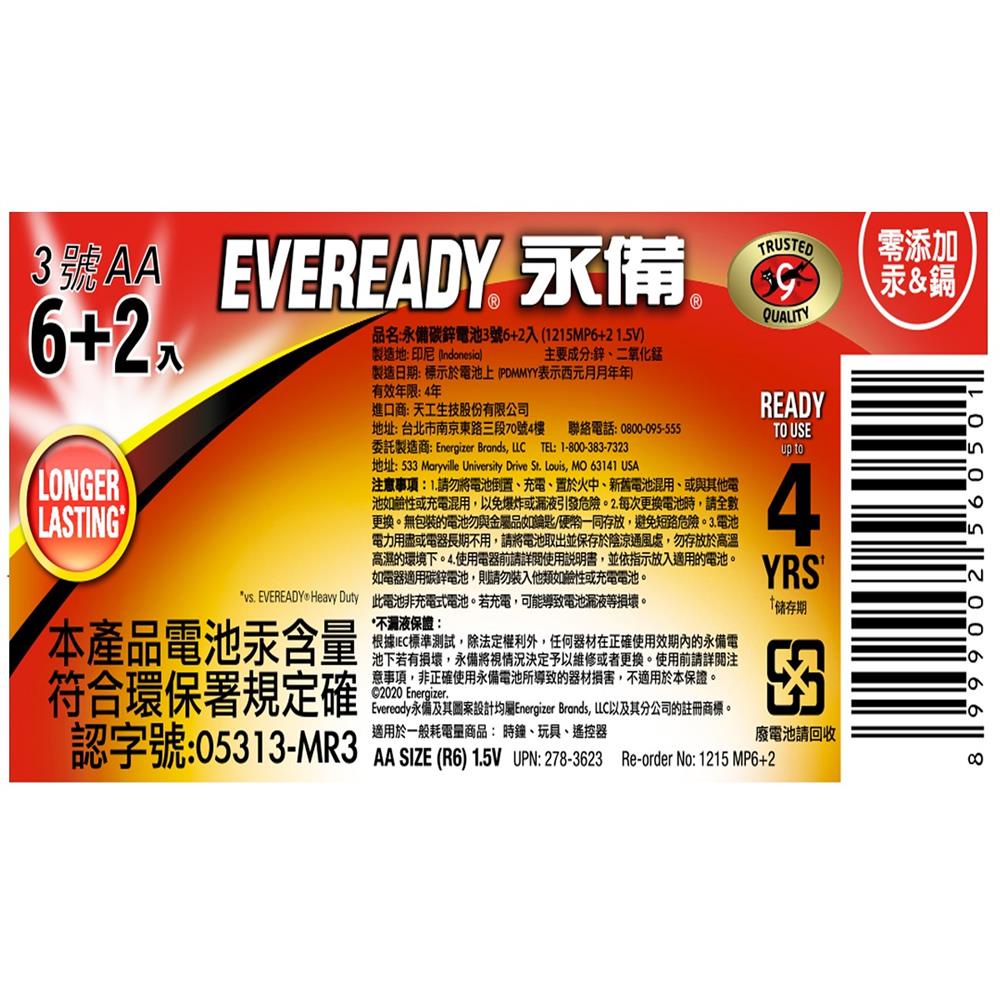 EVEREADY永備碳鋅電池3號6+2入