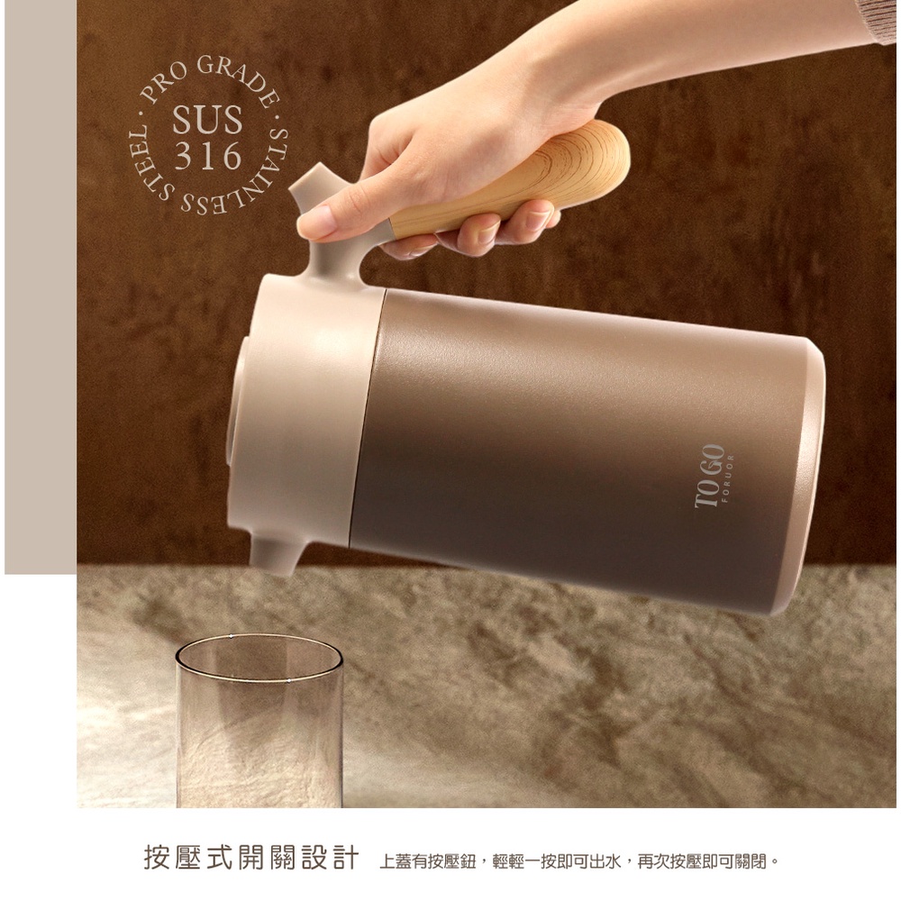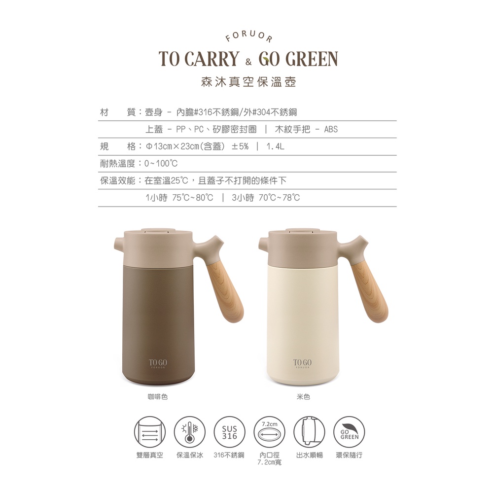 【FORUOR】TOGO森沐 #316不鏽鋼真空木柄桌上保溫壺(1.4L)|2色任選