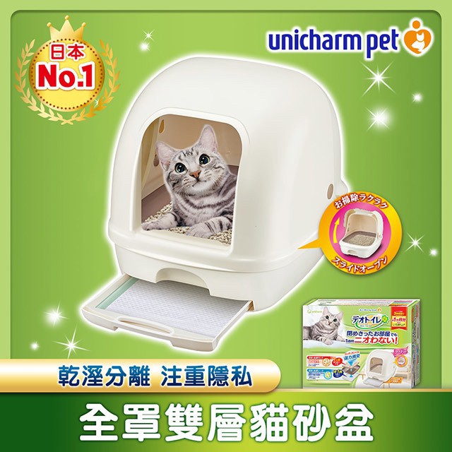 【Unicharm 嬌聯】日本 消臭大師 雙層貓砂盆 全罩式 米白色 曜石黑 貓砂盆-寵物執行長