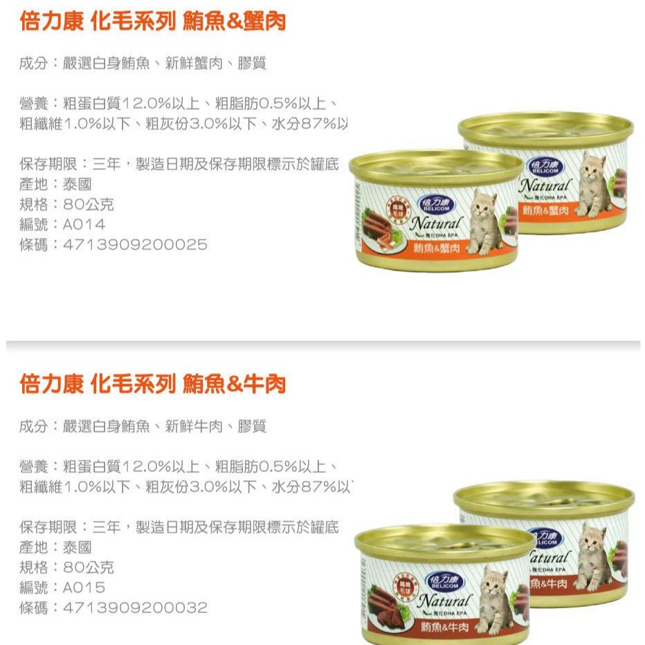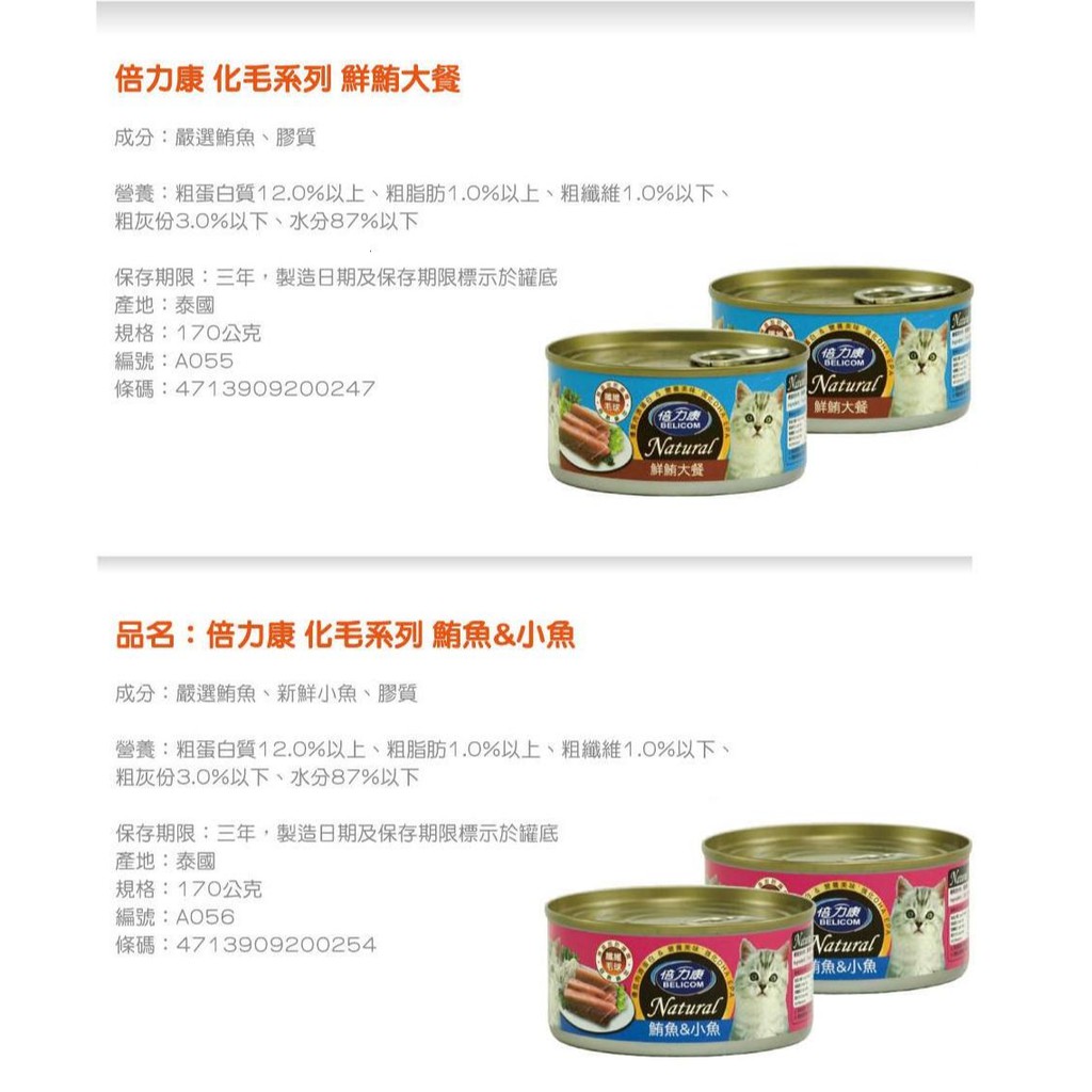 整箱出貨【倍力康Belicom】化毛貓罐 Natura 80g 170g 貓罐頭 鮪魚 起司 鯛魚 鮭魚-寵物執行長