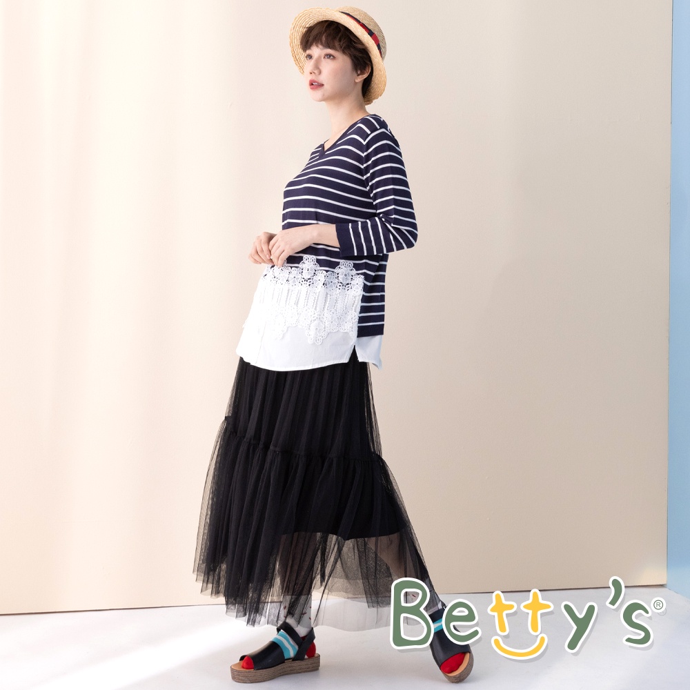 betty’s貝蒂思(11)條紋拼接蕾絲七分袖針織衫 (深藍)