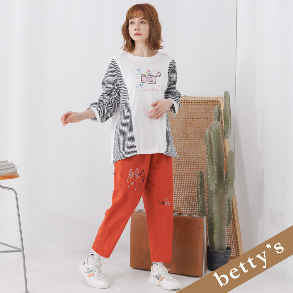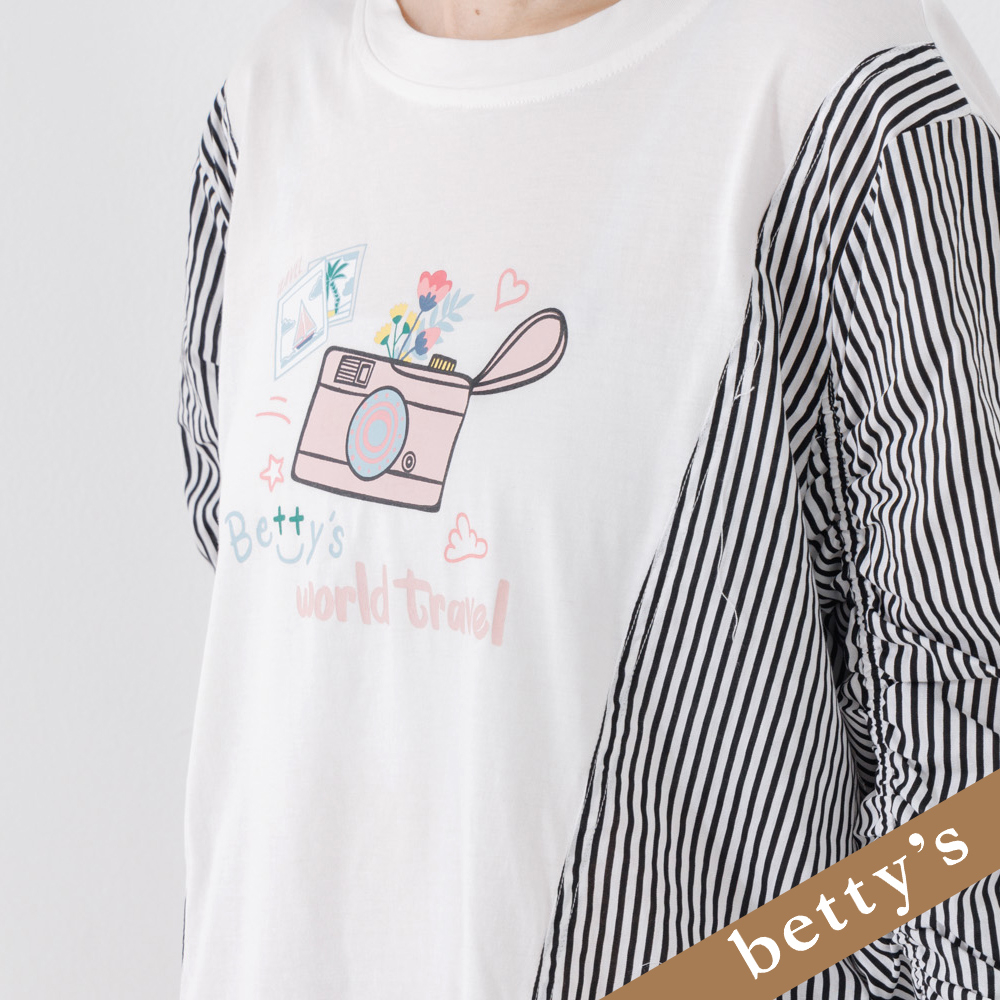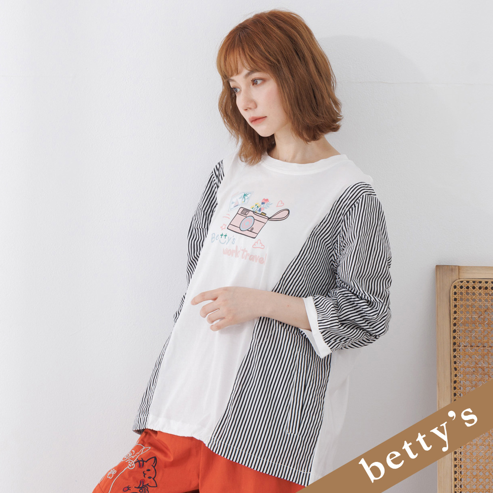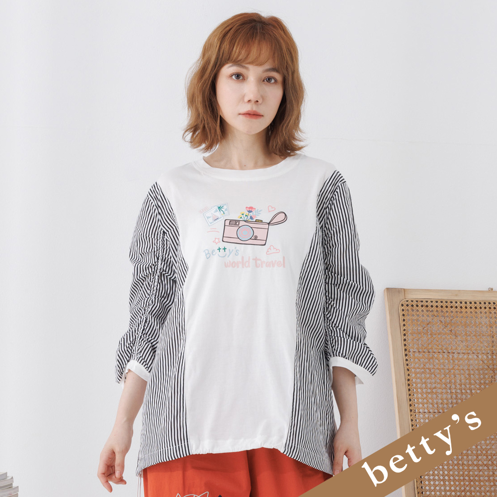 betty’s貝蒂思(25)條紋拼接下擺抽繩七分袖T-shirt(白色)