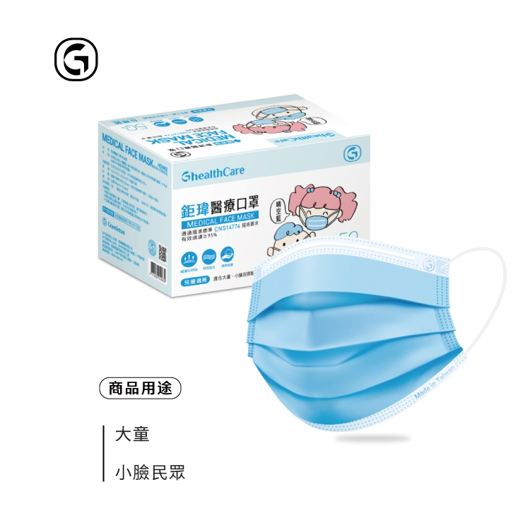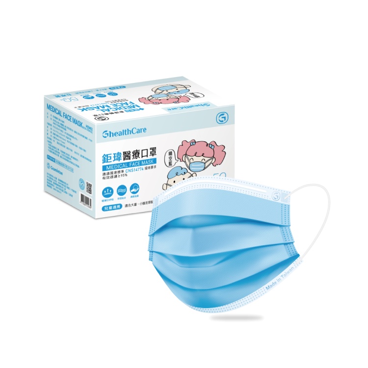 鉅瑋 【兒童醫療口罩-晴空藍】(50片/盒) 藍色口罩 小臉口罩 鉅瑋兒童口罩 兒童口罩 大童口罩 平面口罩 醫療口罩