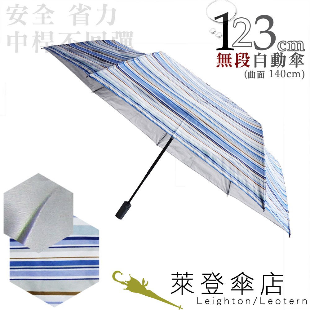 【萊登傘】雨傘 印花銀膠 不回彈 123cm超大無段自動傘 抗UV 防風抗斷 藍白橫條