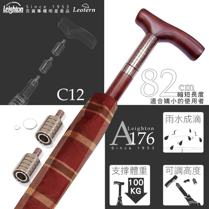 【萊登傘】雨傘 縮短版 調高健行傘 輔助 格紋布 長輩禮物 橘紅褐格