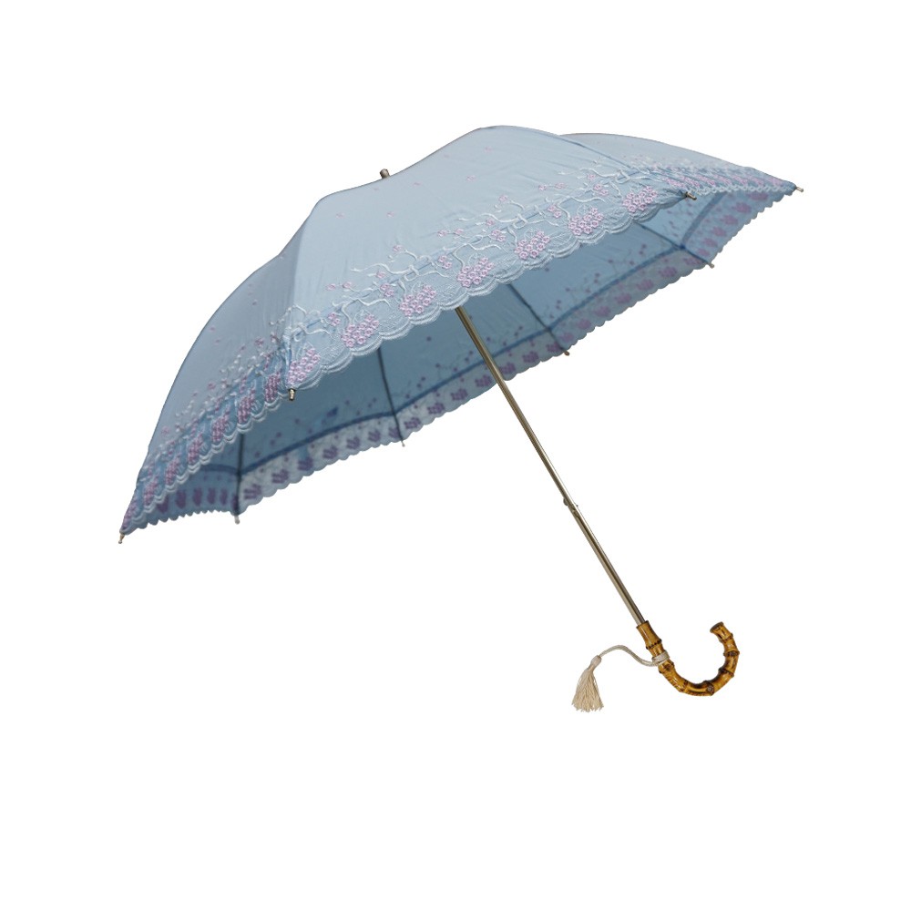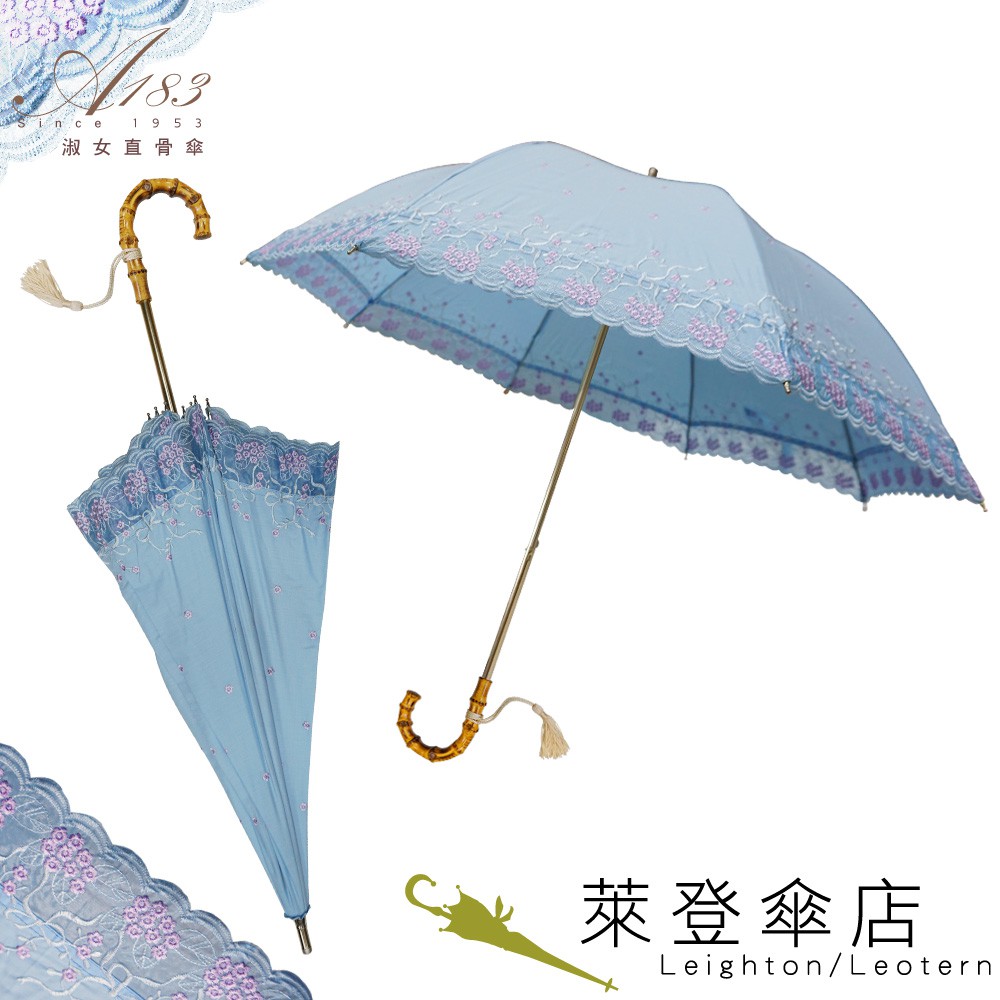 【萊登傘】 刺繡傘 手開直骨傘 竹節把手 流蘇 Leighton 布面小花(天藍) 特價