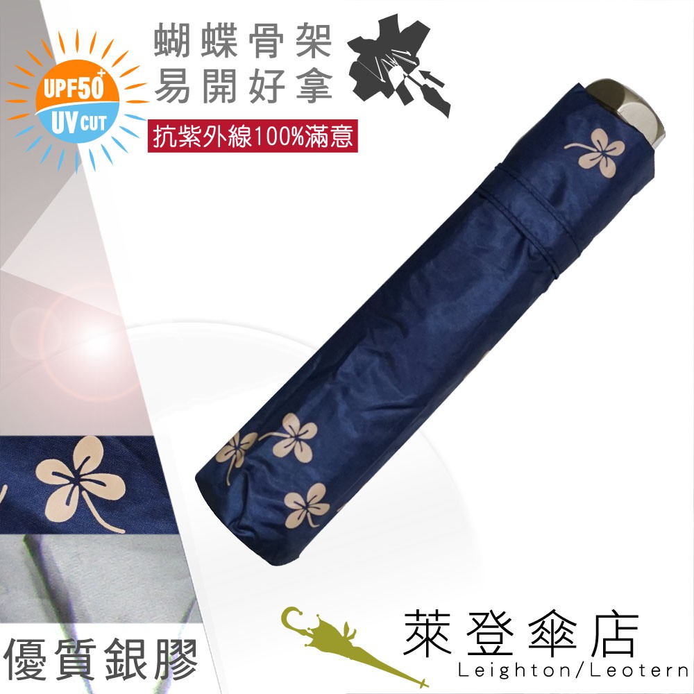 【萊登傘】雨傘 UPF50+ 易開蝴蝶骨 中傘面 陽傘 抗UV 防曬 銀膠 幸運草深藍