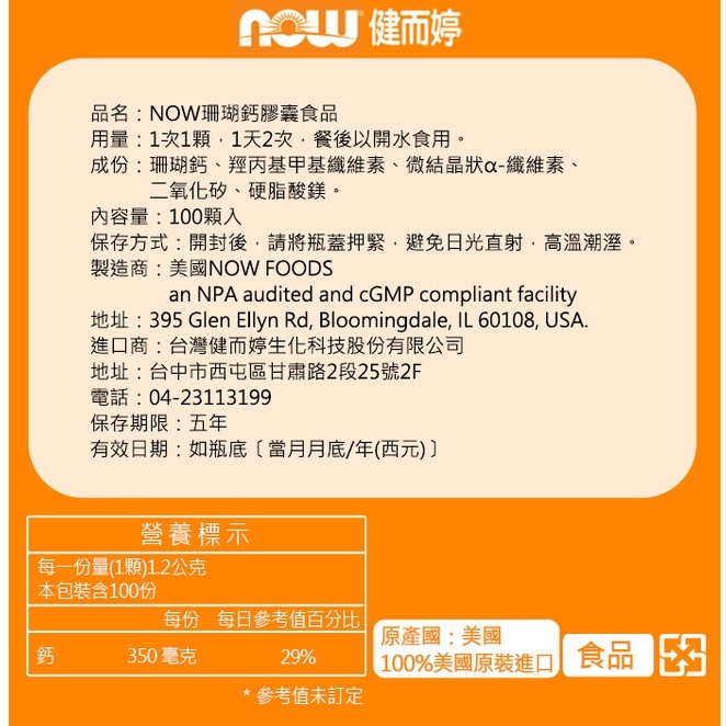 NOW健而婷 珊瑚鈣(100顆/瓶) 台灣官方代理
