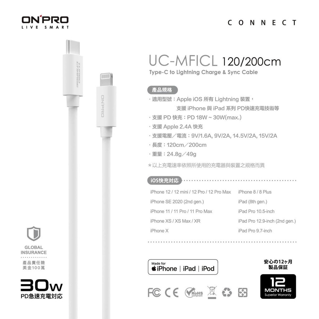 ONPRO UC-QB20 PD20W單孔迷你快充頭+ONPRO UC-MFICL 快充PD30W傳輸線