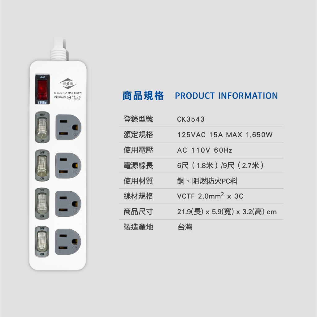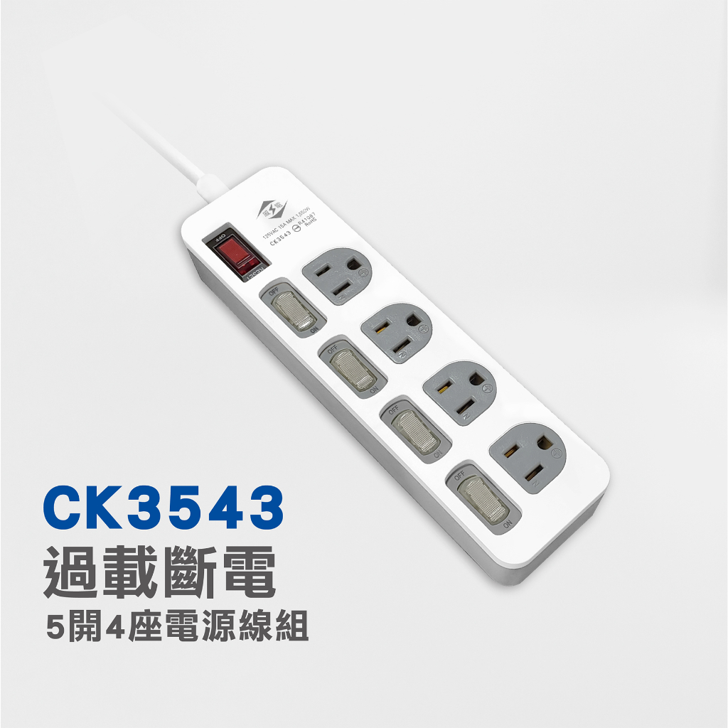 【威電】5開4插延長線 最新安規延長線 防雷抗突波電腦延長線(6-9尺) 台灣製 延長線 CK-3543延長線