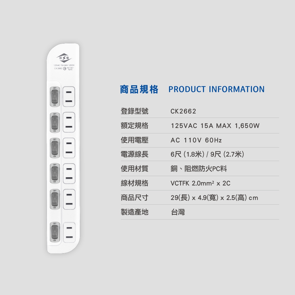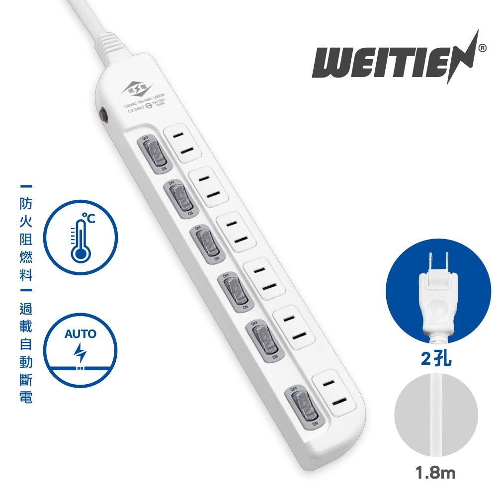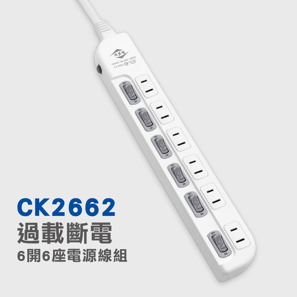 【威電】台灣製延長線 6開6座二孔延長線(6-15尺) 2P延長線 電腦延長線 電源延長線 CK-2662延長線