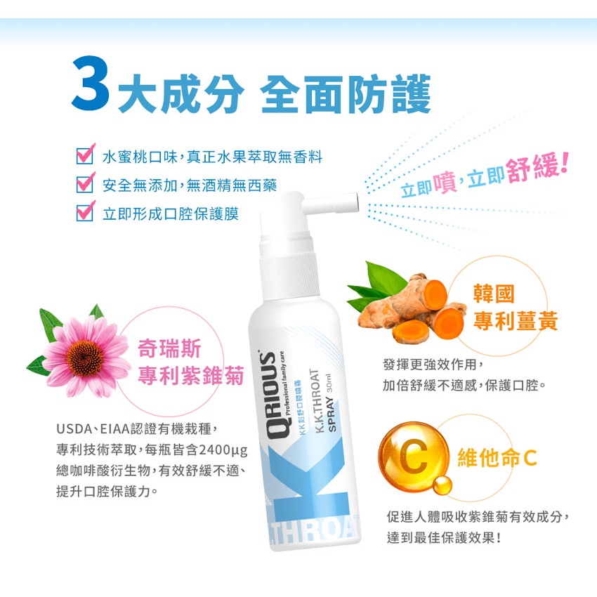 【QRIOUS奇瑞斯】KK刻舒口腔噴霧 水蜜桃口味 紫錐菊 薑黃 維生素C(LAVIDA官方直營)
