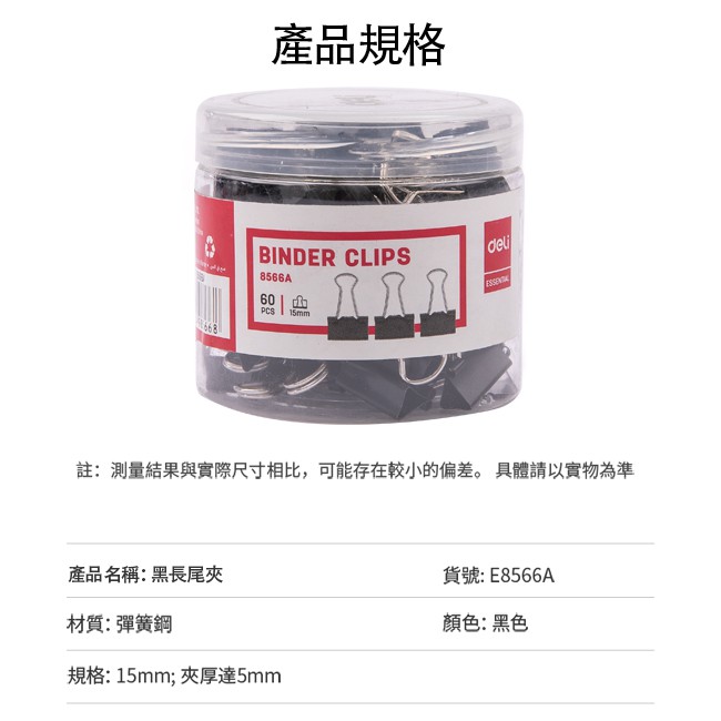 【Deli得力】黑長尾夾15mm-60支(8566A) 台灣發貨|得力旗艦店
