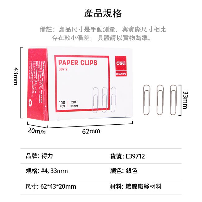 【Deli得力】 迴紋針33mm-100支/盒(39712) 台灣發貨|得力旗艦店