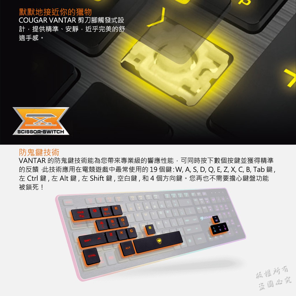 Cougar 美洲獅 VANTAR 剪刀腳鍵盤 /背光效果/剪刀腳/卓越的響應性能/功能快捷鍵/靜音鍵盤/1年保