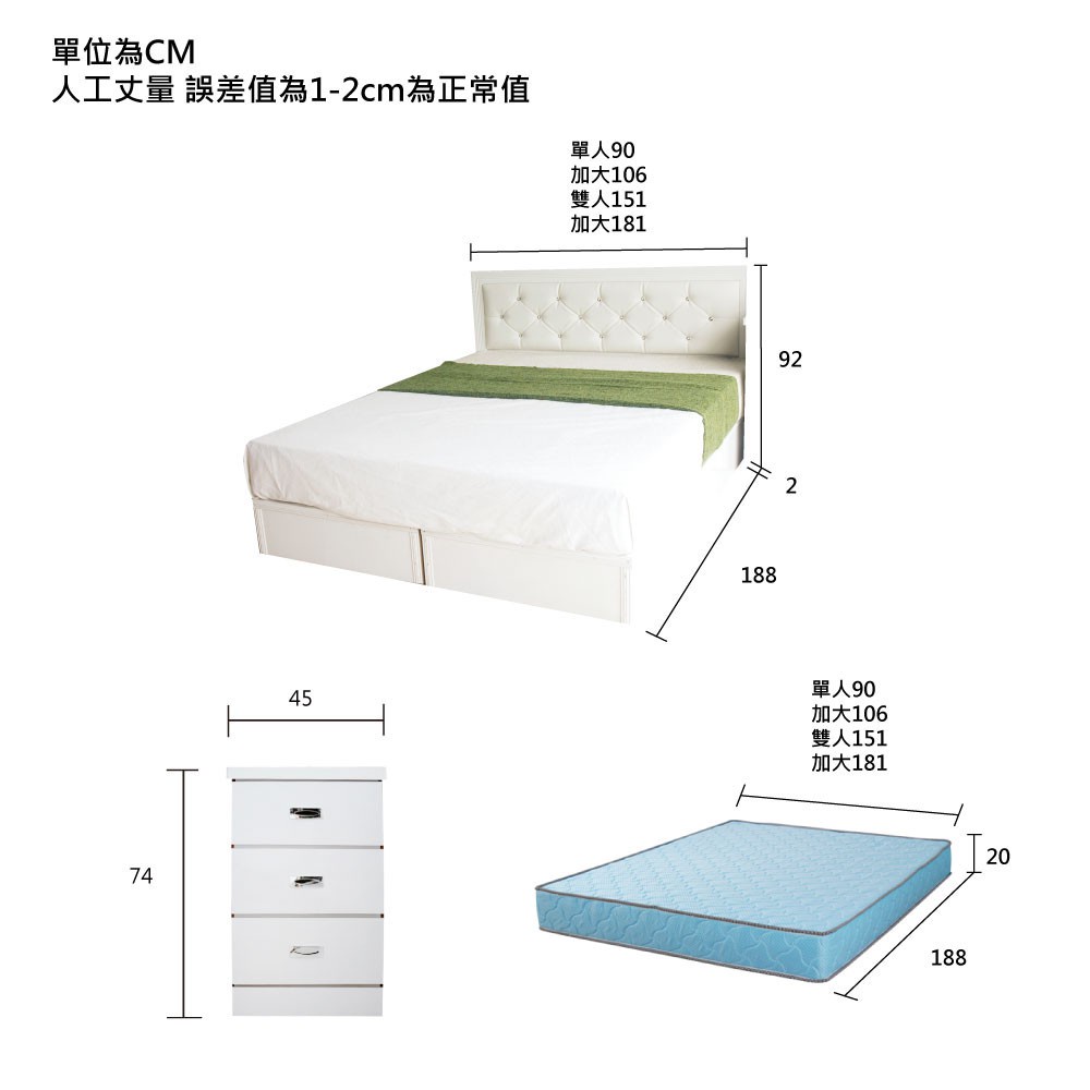 【YUDA】黛曼特純白色 房間組二件組(水鑽石床頭片+加厚六分床底)單大3.5尺.雙人5尺.雙大6尺