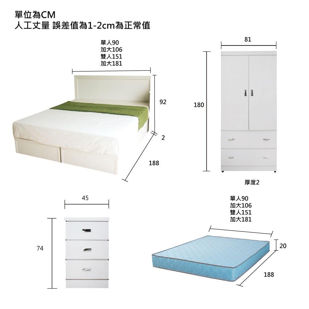 【YUDA】純白色 房間組二件組(床頭片+加厚六分床底)(單人3.5尺.雙人5尺.加大6尺) 新竹以北免運